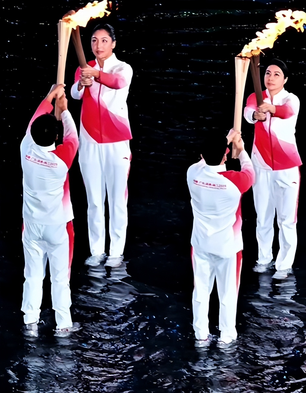 与网球运动员王欣瑜搭档,完成水中火炬传递,在铺设5mm深水幕的舞台上奔跑毫不费力,不愧是雌性中的雌性,太令人敬佩了。