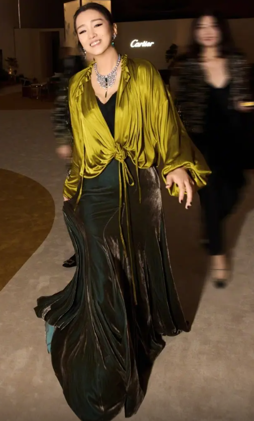 一袭黑色烫绒长裙搭配绿色丝绸外套,佩戴的高级珠宝都不及她本人耀眼。