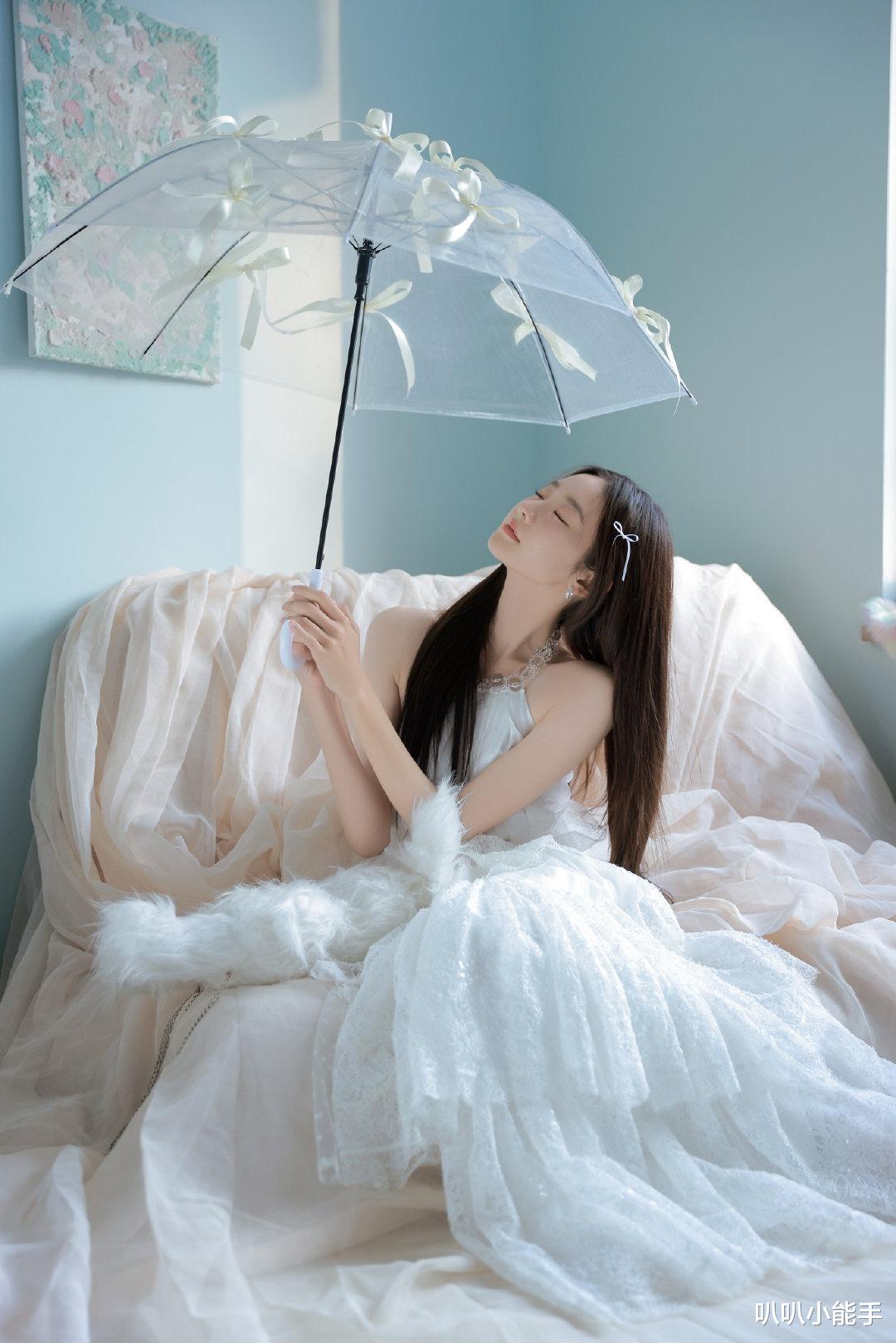 姐姐穿一身奶白色纱裙,往裹满轻纱的沙发上一坐,手里还撑着把缀满蝴蝶结的透明伞,连头发丝儿都裹着“易碎感仙气”,活脱脱是“被上帝偏爱的童话女主角”。有网友锐评:“这状态是偷了仙女教母的魔法棒吗?连伞上的丝带都在替她撒温柔Buff。”