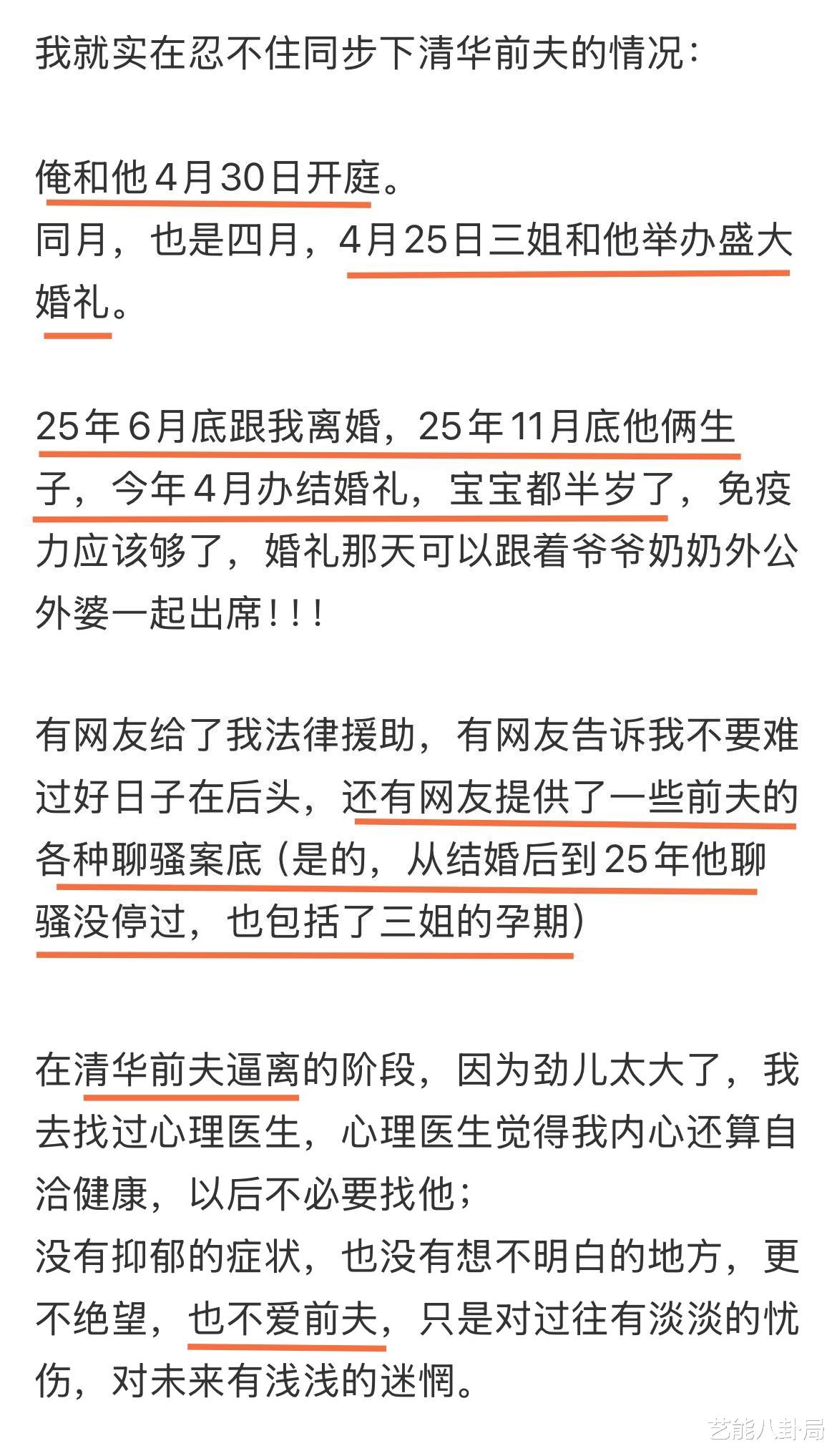 此外,王诺诺还曝光了离婚时间线:2025年6月底两人正式离婚,同年11月底前夫就和新欢生下了孩子;而今年4月25日,刘也行还要和“新三板三姐”在重庆举办盛大婚礼,此时他们的宝宝都已经半岁了。另一边,4月30日王诺诺就要和前夫对簿公堂,这场离婚纠纷还远没有结束。