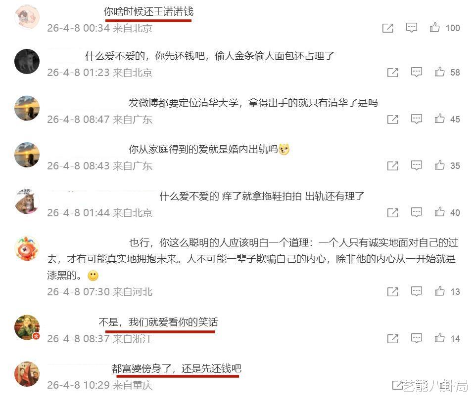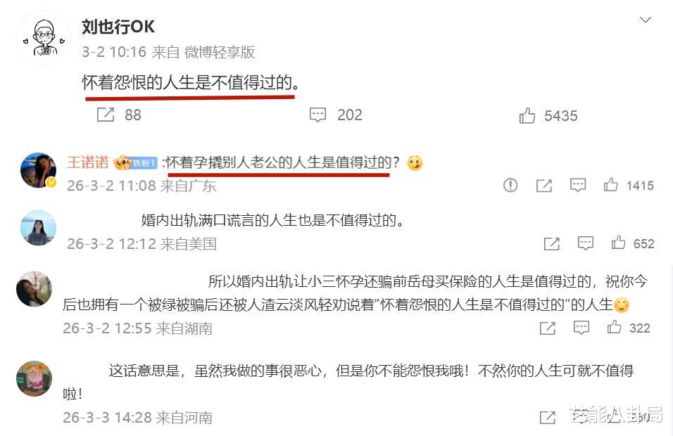 这边前妻撕得火热,那边刘也行的隔空回应,却导致评论区彻底沦陷。他先是发了一条动态,疑似劝王诺诺看开点,称“怀着怨恨的人生是不值得过的”。结果王诺诺直接在评论区回怼:“怀着孕撬别人老公的人生是值得过的?”