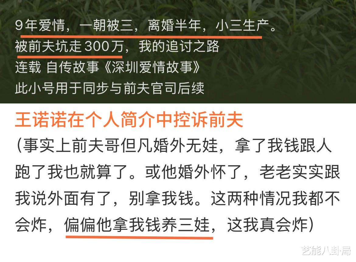 王诺诺放出重磅猛料:她和刘也行结婚3年,相处近9年,却发现他婚内出轨,更离谱的是“第三者”已怀孕数月,“他着急跟我离婚,好给已怀胎5月的‘三姐’一个名分!”无奈之下,她只能答应离婚。