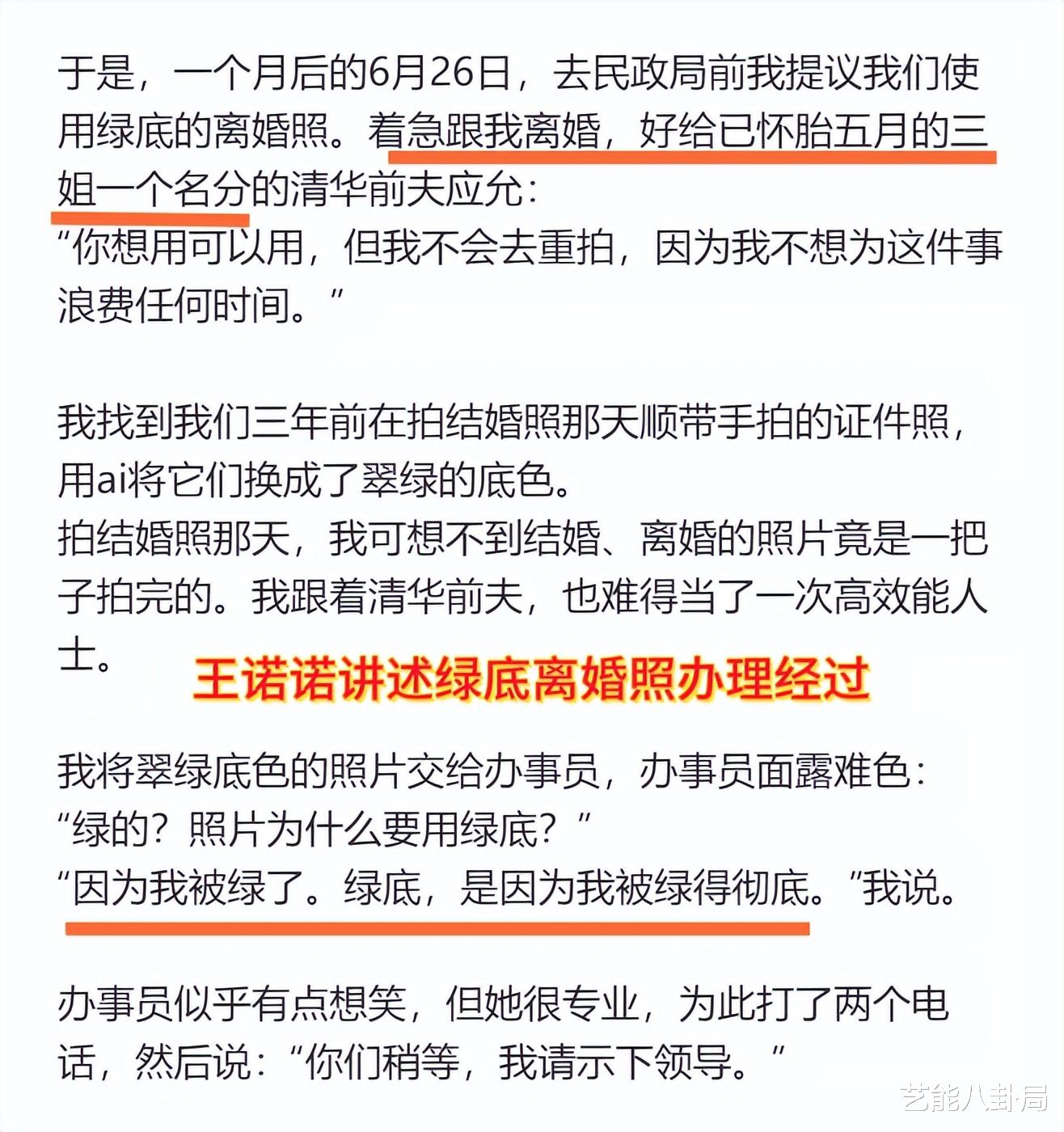 为了出一口恶气,王诺诺还晒出了全网独一无二的绿底离婚照。她在办离婚证时突发奇想,提出要使用绿底证件照,男方随口就应了,“你想用可以用,但我不会去重拍,因为我不想为这件事浪费任何时间。”
