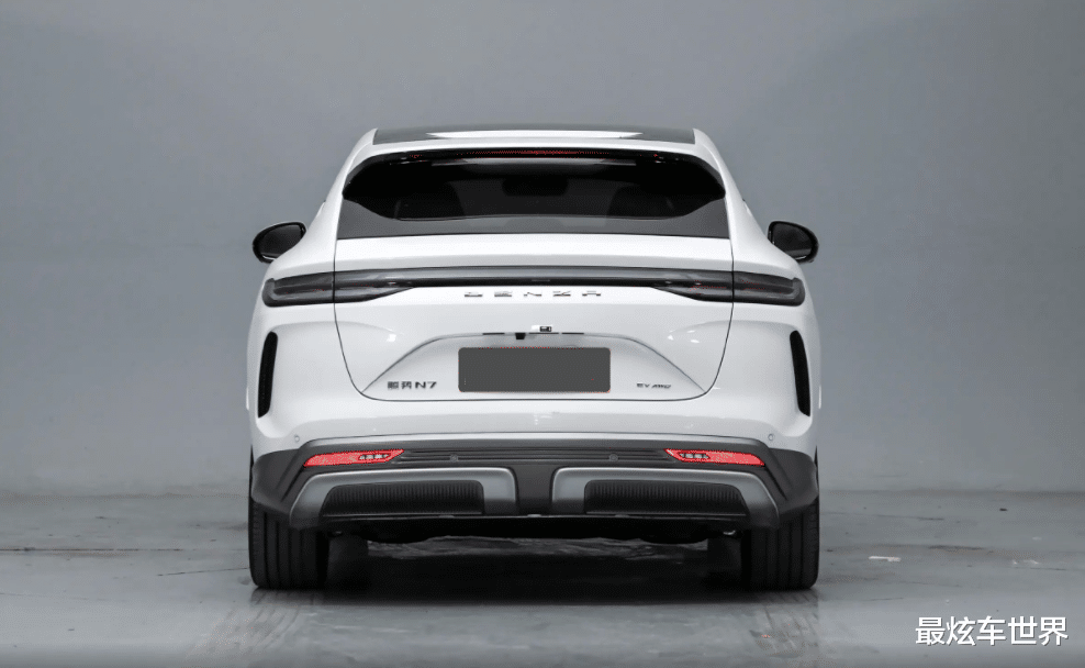 从车尾来看,顶部镂空式的扰流板很抢眼,同时再配合上尾部进行熏黑处理的贯穿式尾灯组,以及底部略显粗犷的底护板,更是让新车的尾部也具有浓厚的运动氛围。不仅如此,当腾势N7的尾灯组在夜间亮起时,更是将现代科技感和运动时尚感完美融合,营造出不错的视觉效果。