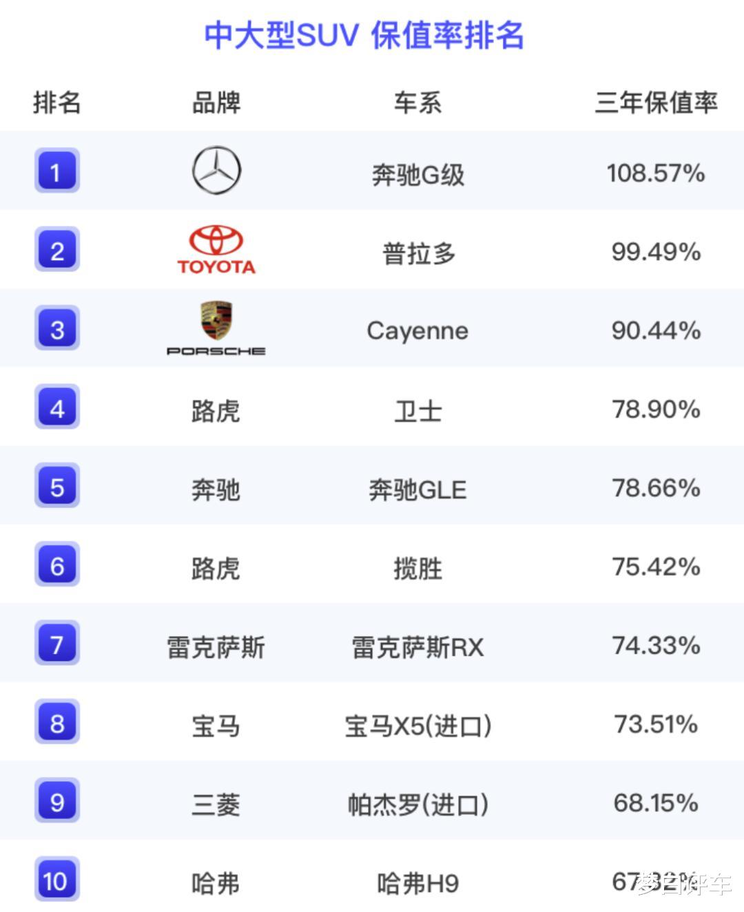 中大型SUV的保值率跨度比较大,排名前三的奔驰G级、丰田普拉多和保时捷卡宴,其保值率都超过了90%!路虎卫士、奔驰GLE和路虎揽胜也都在75%以上,雷克萨斯RX仅排名第7位,宝马X5进口、帕杰罗进口和哈弗H9也都是入榜前十,不过宝马X5进口车型的表现并不太理想。