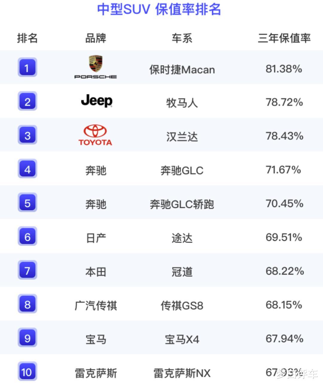 保时捷Macan、牧马人和汉兰达稳居前三,汉兰达的保值率达到了78%,还是比较不错的,奔驰GLC排名第四位,保值率也是超过了70%。而日产途达、本田冠道、传祺GS8、宝马X4和雷克萨斯NX也都是入榜前十,不过它们的保值率都在70%以下。