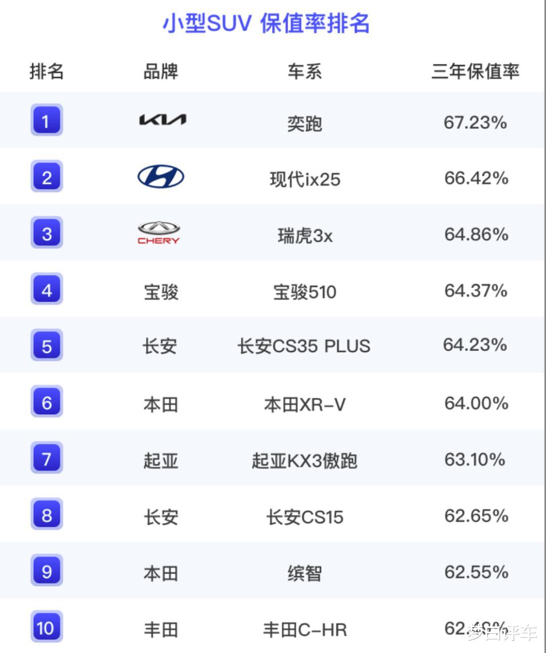 数据显示,韩系SUV表现亮眼,起亚奕跑和现代ix25包揽了冠亚军,国产SUV奇瑞瑞虎3x、宝骏510和长安CS35 PLUS也是入榜前五。而消费者比较认可的本田XR-V、本田缤智和丰田C-HR等日系小型SUV,保值率反而没有国产SUV高!本田XR-V排名第六位,保值率为64%,本田缤智排名第九位,保值率只有62.5%。