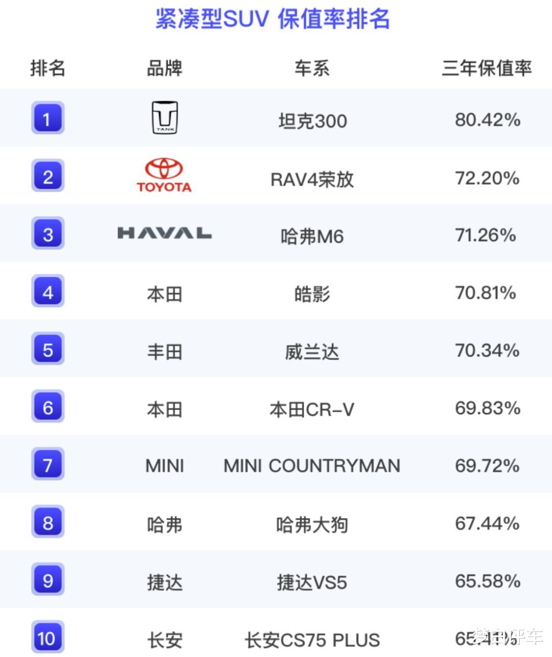 超过70%的车型共有5款,国产SUV夺得冠军,坦克300的保值率超过了80%,真的是非常保值了,丰田RAV4荣放和哈弗M6分列二三位。本田皓影和丰田威兰达入榜前五,保值率也都在70%以上。本田CR-V仅排名第六位,其保值率跌破了70%,哈弗大狗、捷达VS5和长安CS75 PLUS也都是入榜前十,保值率都在65%以上。