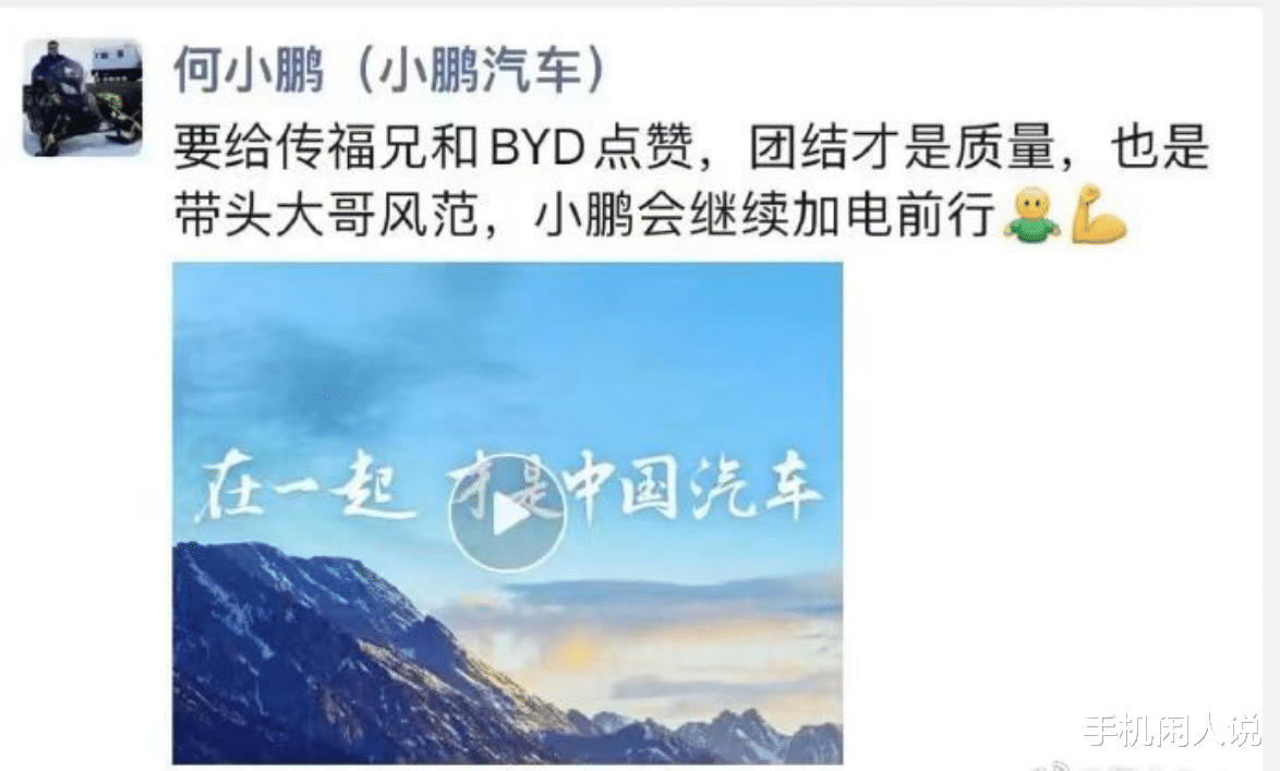 小鹏汽车创始人何小鹏在朋友圈表示::“要给传福兄和BYD点赞,团结才是质量,也是带头大哥风范,小鹏会继续加电前行。