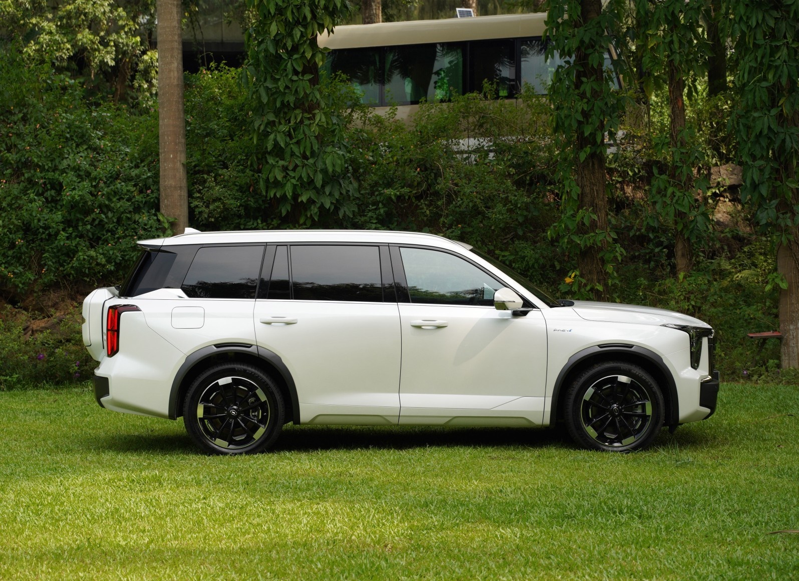 再来看新车的侧面部分,新车的车身不仅方正且非常的厚重,车顶部分不仅非常的平直而且十分的厚重,下方大尺寸的熏黑车窗部分还采用了贯穿式的个性造型,让悬浮式车顶视觉效果更加出众,车门部分更是有着整体隆起的贯穿式腰线设计,连接车门把手看起来更加的修长,轮眉部分更是有着外扩明显的熏黑饰板镶嵌,结合大尺寸的多幅式轮毂以及厚重的车裙底部设计,看起来整体感更加出色,且运动感十足,车身尺寸方面,新车的长宽高分别为5110mmx1976mmx1780mm,轴距更是达到了2920mm,结合大七座布局内部空间十分的宽裕。