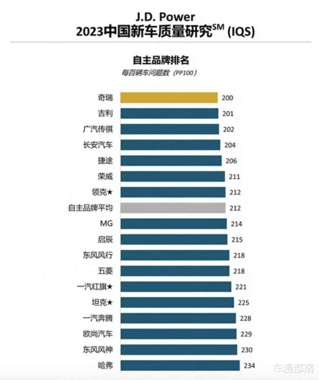 关于这种质量排名规则,不少吃瓜群众应该很熟悉了。它是按照每百辆车的问题数来评定的,简称PP值。那么先看自主品牌,整个的PP平均值是212,咱们姑且把它视作及格线吧。及格线以下,东风被大羞辱,属下的三个牌子,风神、风行、以及启辰,百车问题数分别为230、218和215。
