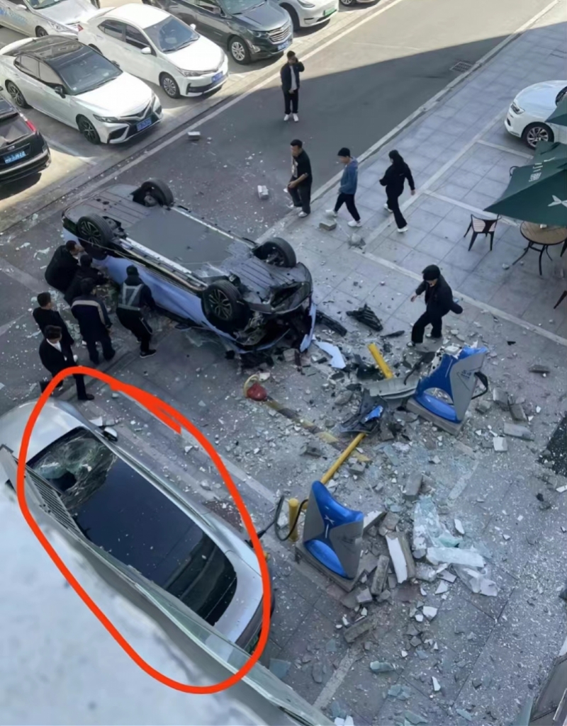 现场图片显示,坠落的小鹏P5“四轮朝天”,损毁较为严重,露出汽车内部结构,楼下的小鹏充电桩也遭损毁,地上一片碎玻璃;楼下一台正在充电的小鹏P7车顶及前挡风玻璃受损较为严重。