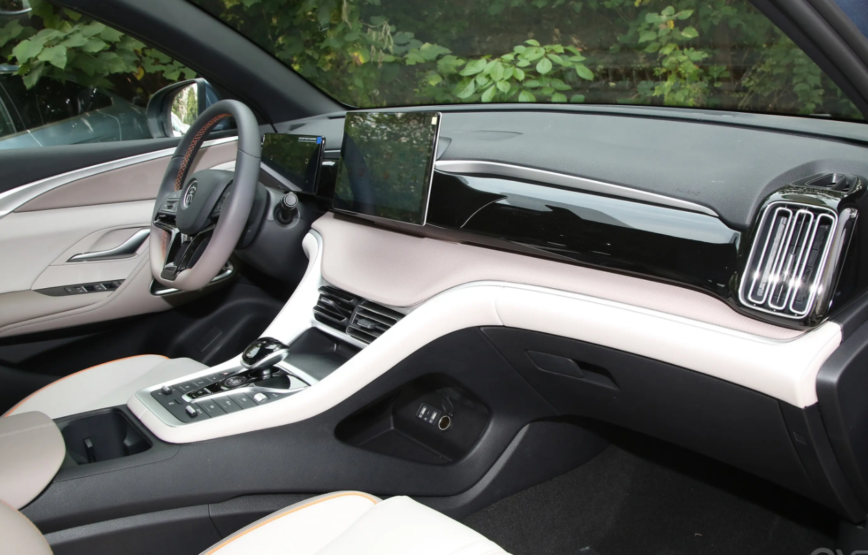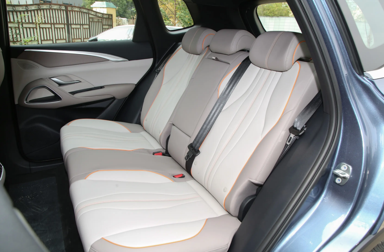 内饰的年轻化主要体现在配色和材质上的调整。新增了一种被称为净月米色的内饰配色,主要是象牙白和浅棕色的组合,既有家用车的温馨舒适感,又有新能源车的未来感。白色部分都采用了软材质包裹,给人一种高级感觉。同时,中间饰板采用了一种类似于织物的软材质,比之前的磨砂饰板要轻盈一些。这种材质也出现在车门上,给人一种舒适温馨的感觉。此外,宽大舒适的白色座椅是一体式运动座椅,而橘色的勾边则增添了一丝活力,突显了年轻感,但不会显得过于突兀。