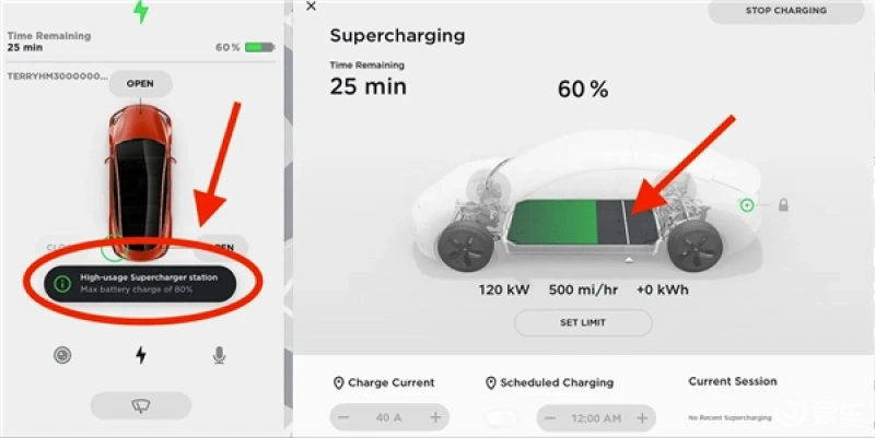早在2019年,特斯拉开始在部分繁忙的超充站点限制用户的充电时间,汽车电量默认只能充至80%,用户想要充满,需要需要手动确认。