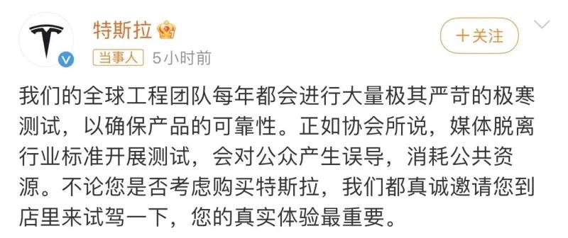 今日上午,特斯拉官方发布微博称:我们的全球工程团队每年都会进行大量极其严苛的极寒测试,以确保产品的可靠性,正如协会所说,媒体脱离行业标准开展测试,会对公众产生误导,消耗公共资源。