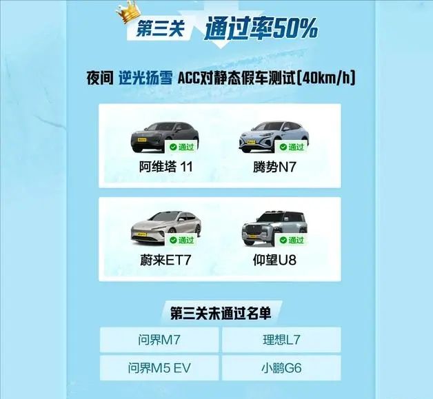值得一提的是,在此次懂车帝冬测的ACC智能化恶劣工况冬季测试之中,特斯拉仅仅通过了夜间雪地ACC测试(60km/h)而在夜间逆光ACC测试(60km/h)和夜间逆光扬雪ACC测试(60km/h)之中,特斯拉的MODEL Y都没有通过测试。而阿维塔11、腾势N7、蔚来ET7、仰望U8四款车型表现惊艳,通过了全部的测试。