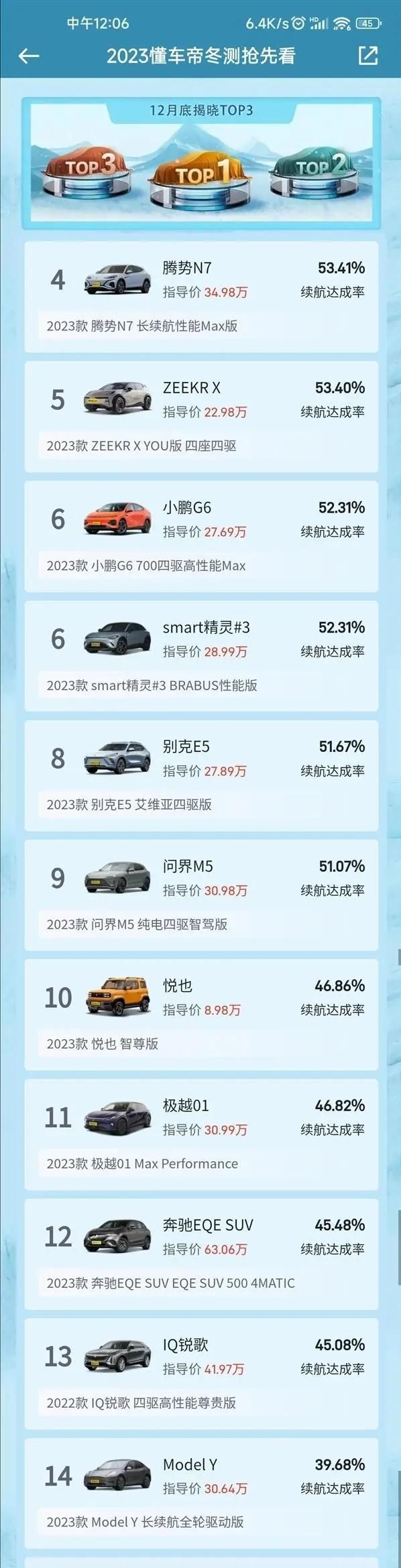 而参测的十四款车型之中,腾势N7 长续航性能Max版续航达成率为53.41%,位于测评车型第四名,该车官标续航里程为630km。另外,极氪X、小鹏G6、Smart精灵#3、别克E5、问界M5纯电四驱等车型紧的续航达成率均在50%以上。根据目前已经公布成绩的14款车型的数据来看,参与该项测试的14台车平均续航里程为308.9km,平均续航达成率为50.75%,而特斯拉无论是续航成绩,还是续航达成率,都要明显低于平均水平。