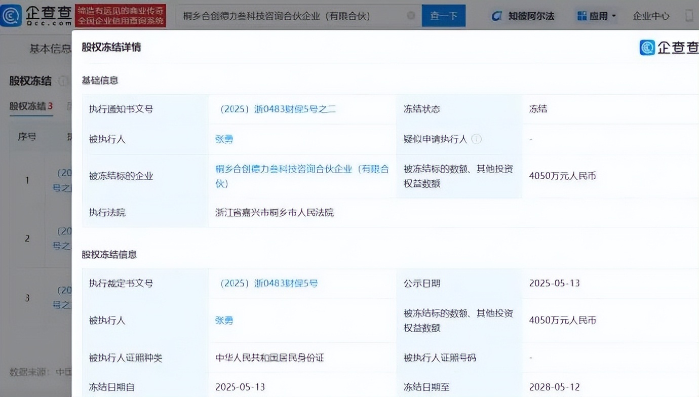5月26日,据白鹿视频消息,企查查APP显示,近日,张勇新增一条股权冻结信息,冻结股权数额4050万元人民币,被冻结标的企业为桐乡合创德力叁科技咨询合伙企业(有限合伙),冻结日期自2025年5月13日至2028年5月12日,执行法院为浙江省嘉兴市桐乡市人民法院。
