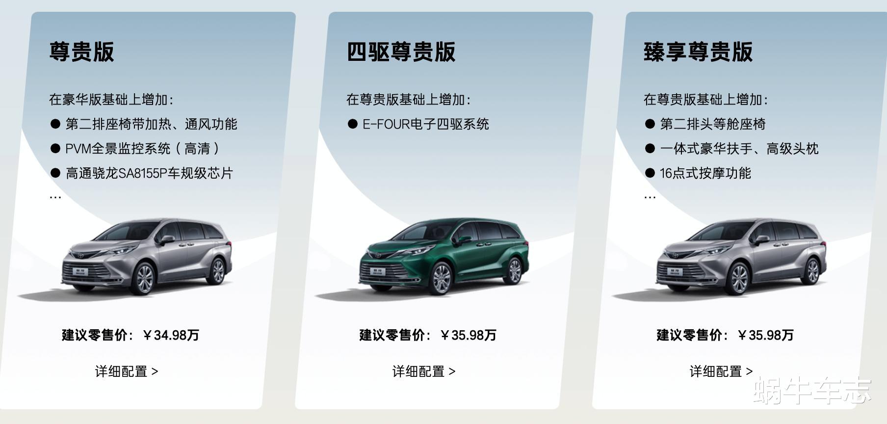如果你没有四驱需求,有商务需求,我觉得最精华的版本应该是臻享尊贵版,它还多出了第二排头等舱座椅,有一体式扶手、头枕等,还有16点式按摩功能,这个版本可以让你不用再羡慕国产MPV的配置。有人说赛那是“小小埃尔法”,我觉得也只有到这个版本,它才能这样被定义。