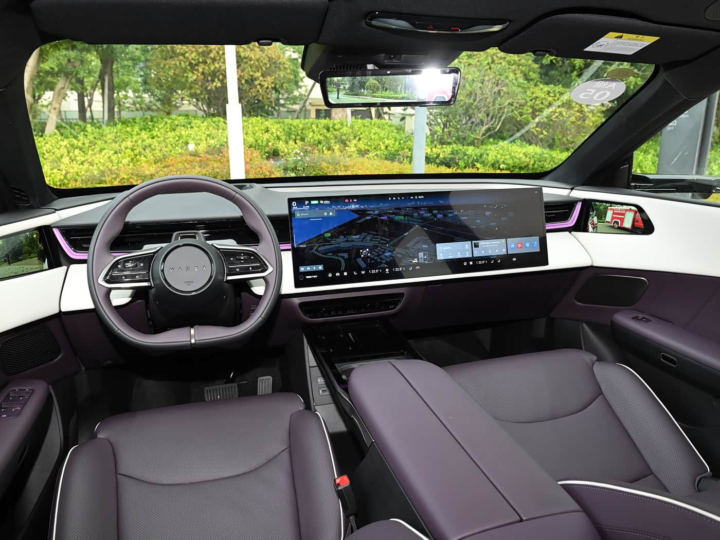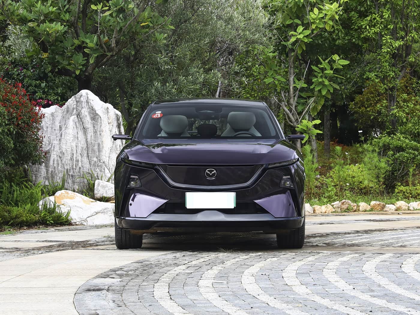 我们首先来看新车的外观设计方面,新车的前脸采用60mm深度发光立体标识之翼设计,相比主流10mm深度的贯穿式灯带更具视觉张力。封闭式格栅下方梯形进气口内嵌毫米波雷达模块,分体式大灯组上沿细长灯带形成怒目微笑表情,配合可发光车标实现动态迎宾灯效。引擎盖风道与两侧导流槽构成九风道系统首组通道,高速行驶时可增加11kg下压力。前保险杠底部银色护板兼顾实用性与运动感,整体造型在新能源简洁风格中保留了马自达独特的攻击性。