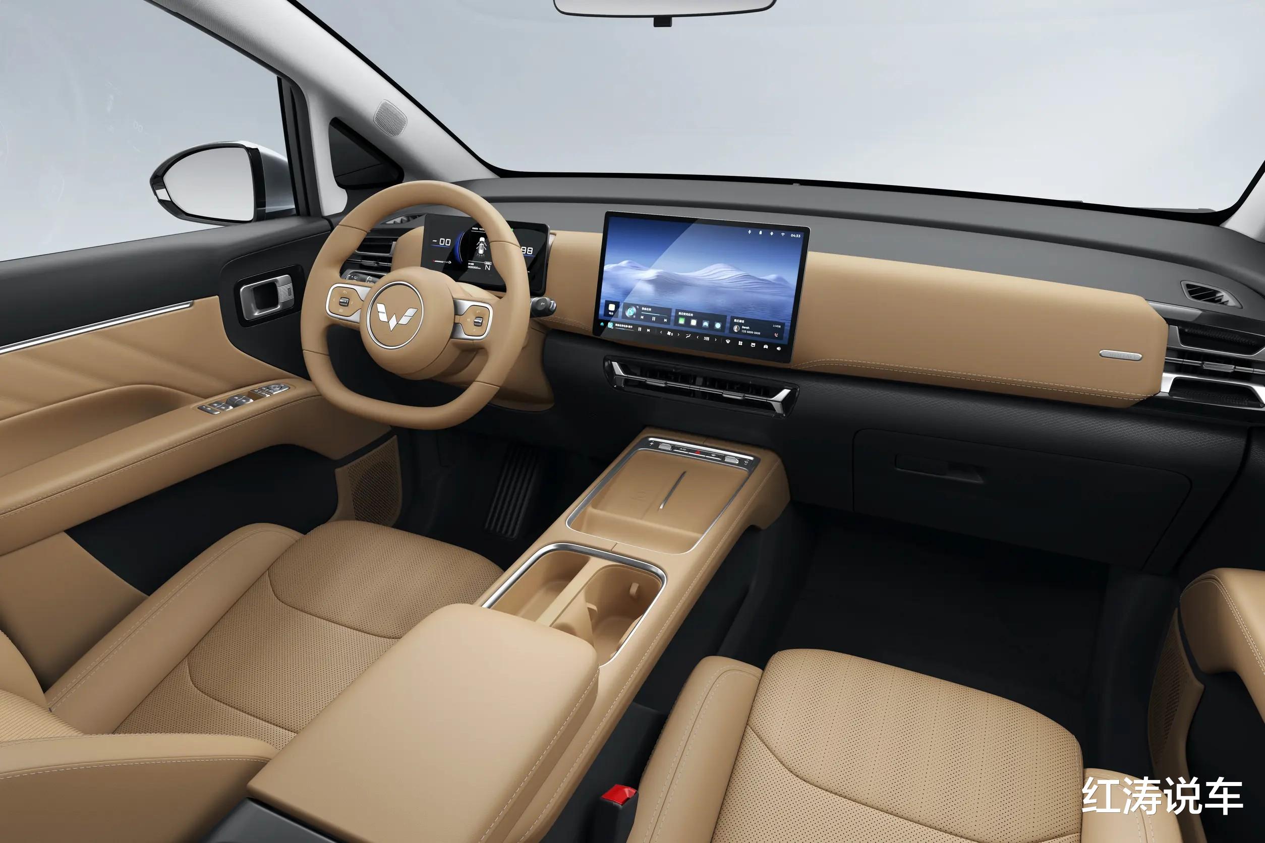 内饰方面,五菱星光730提供胡桃棕和暖沙棕的配色,中控台布局简洁,中间部分使用皮质覆盖,并加入了缝线处理,左右两侧的空调出风口也应用到了双层元素,平底多功能方向盘款式好看,采用时下流行的电子怀挡,配备液晶仪表、悬浮式中控大屏。