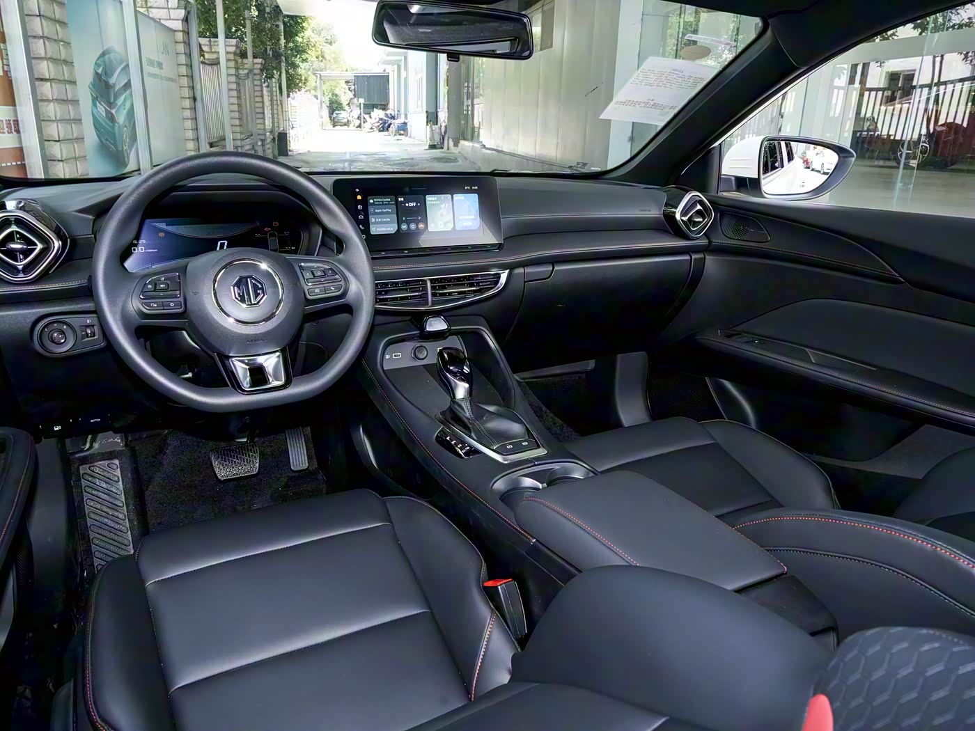 我们首先来看新车的外观设计方面,新车的前脸采用第三代家族设计语言,大尺寸直瀑式格栅搭配超薄镀铬饰条,形成玛莎拉蒂式的前脸既视感。新增气泡橙车漆与黑色蜂窝中网形成强烈撞色,配合三角形LED猎瞳大灯(内置MG徽标浮雕)及前唇扩散器设计,攻击性十足。1842mm超宽车身配合下压式引擎盖,营造出低趴的战斗姿态,同级罕见的镂空风道设计进一步强化运动基因。