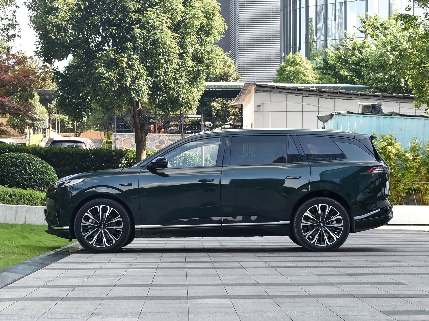 再来看车身侧面部分,侧面轮廓延续"5米+3米+"黄金比例(5002mm车长/3025mm轴距),悬浮式车顶配合21英寸多辐轮毂(马牌EC7轮胎)提升视觉张力。隐藏式门把手降低风阻,D柱侧窗集成充电指示灯。后排升级双层夹胶隐私玻璃,紫外线阻隔率出色,腰线为贯穿式造型,结合外扩的轮眉,看起来更加厚重而饱满,车门底部细长的镀铬饰条镶嵌也是层次感十足。长宽高分别为5002/1972/1732毫米,轴距为3025毫米,与在售六座版车型保持一致,定位于中大型SUV。