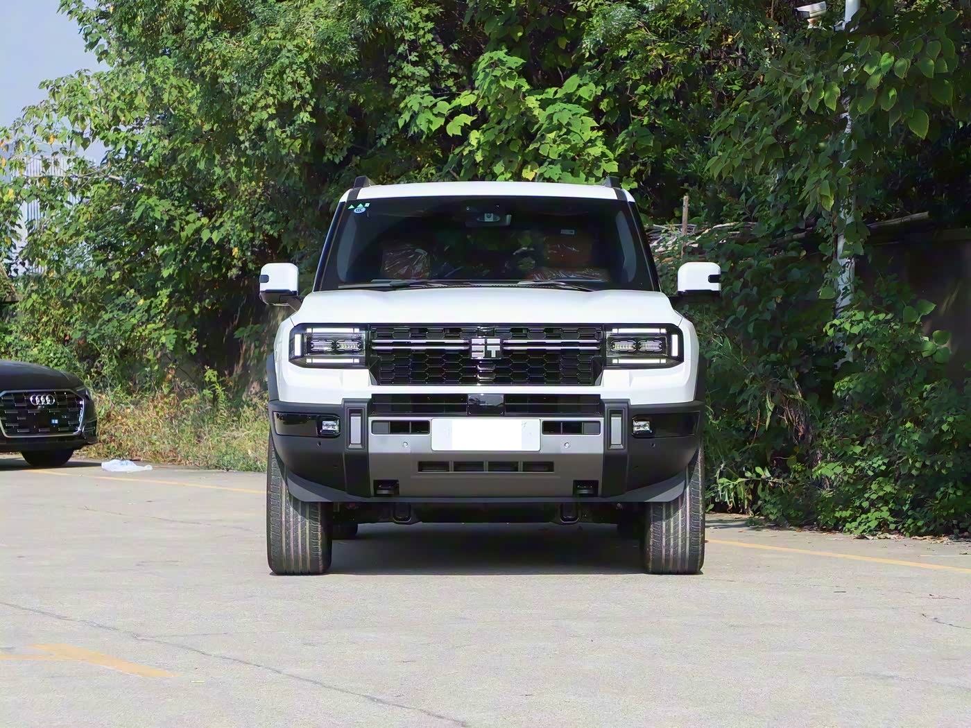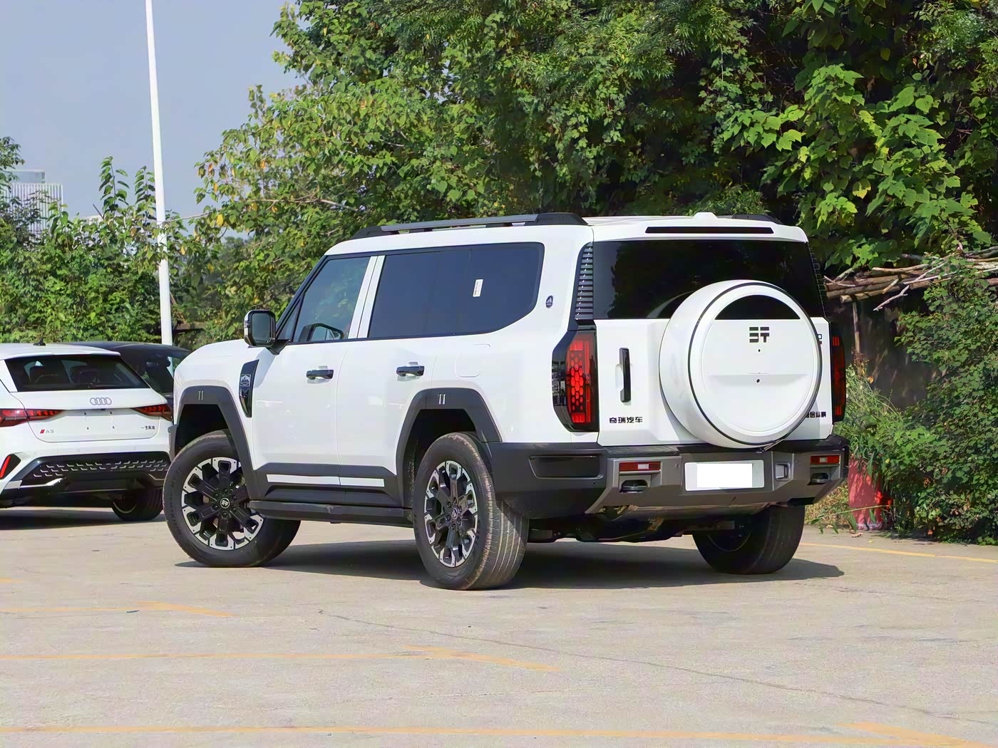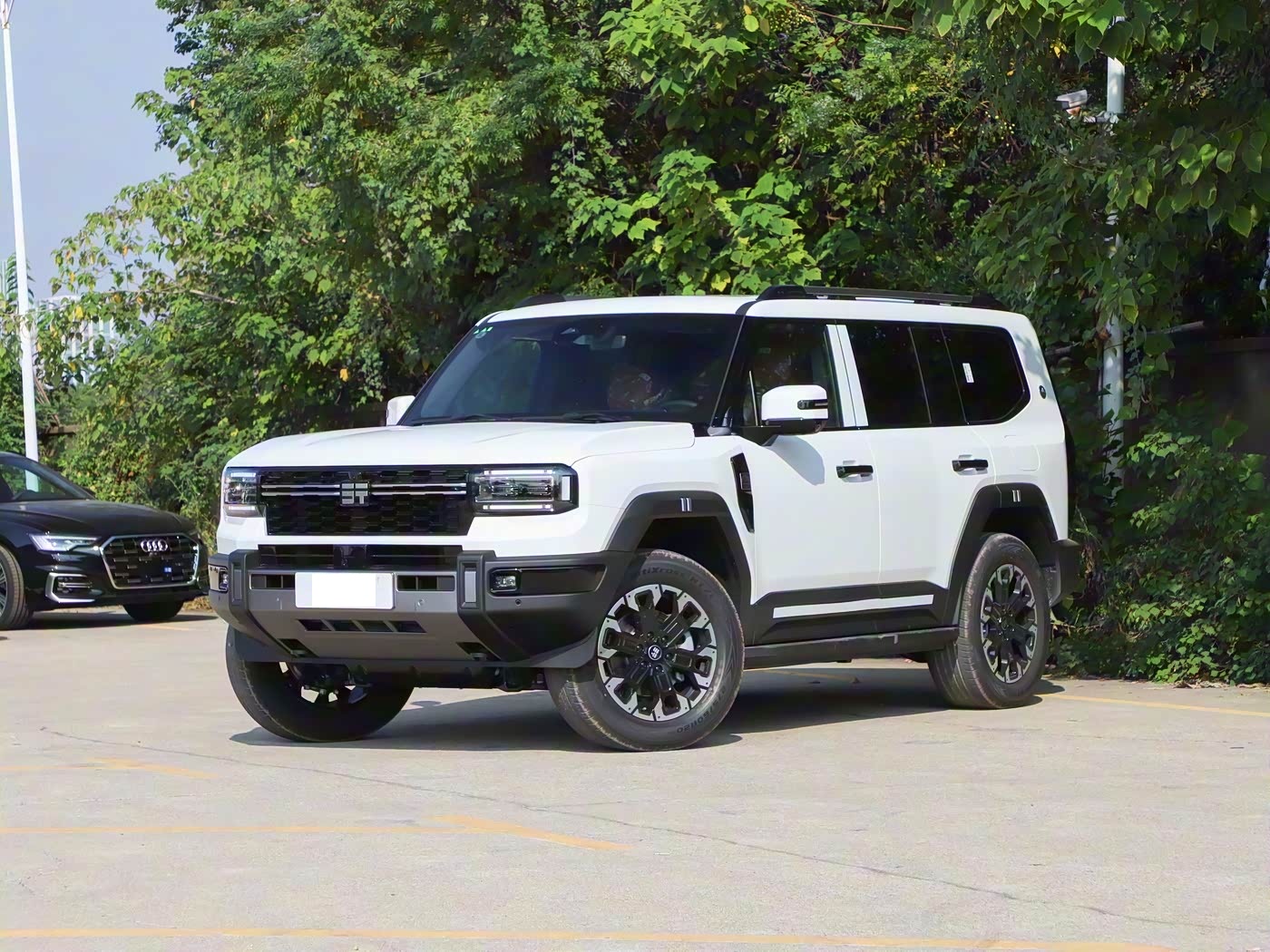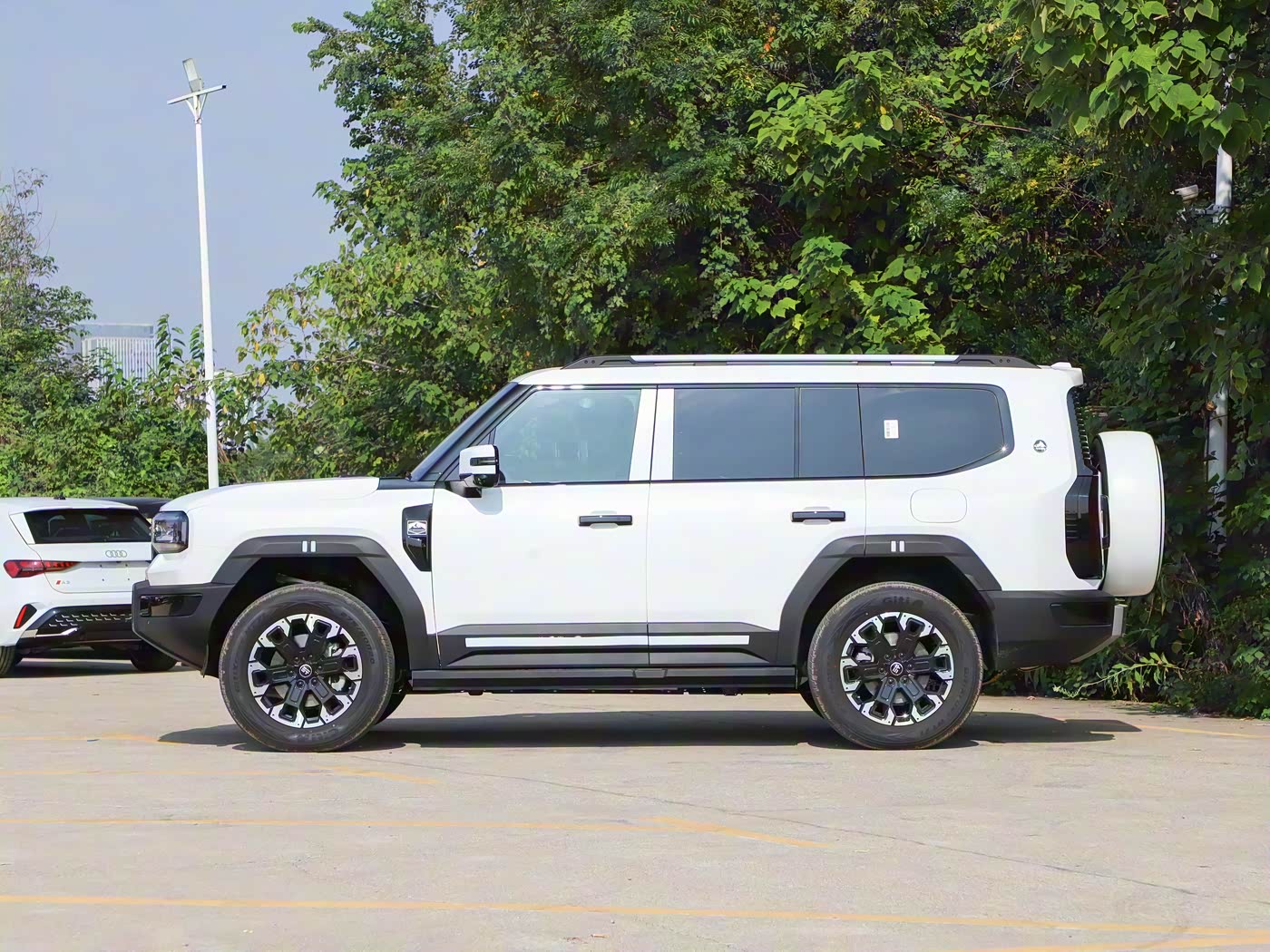 再来看车身侧面部分,经典 “方盒子” 造型赋予 G700 强烈的肌肉感,5198/2050/1956mm 的长宽高与 2870mm 轴距,使其相较方程豹豹 8 更具空间优势。立体硬朗的腰线从车头延伸至车尾,搭配宽大熏黑轮眉,进一步强化力量感,而车顶行李架、后视镜的黑化处理则增添运动气息。轮毂提供 18 英寸与 20 英寸两种选择,均匹配全地形 AT 轮胎,275/60 R20 规格的佳通轮胎能轻松应对复杂路况。车身侧面还预留了轮眉灯、固定踏板等个性化选装位,兼顾实用性与改装乐趣。短前悬长后悬的比例设计,不仅优化了 35° 接近角与 28° 离去角,更让整车姿态如 “蓄势俯冲的雪豹”。