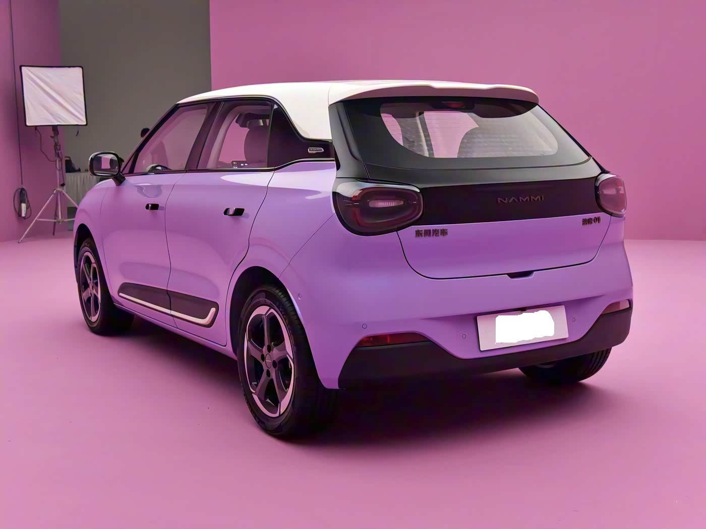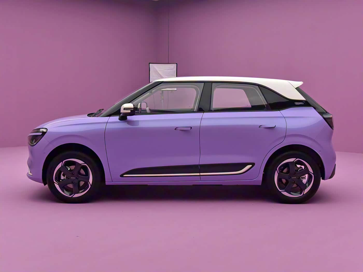 再来看车身侧面部分,车身侧面以短前后悬设计为核心亮点,在紧凑尺寸中实现空间最大化(具体长宽高未公开,轴距推测约 2500mm 级)。一条流畅的腰线从车头翼子板延伸至车尾,与微微内凹的车门线条、外凸的轮拱形成呼应,勾勒出类似 “健身线条” 的肌肉感,打破小型车的单薄印象。15 英寸五辐旋风轮毂为全系标配,黑色涂装搭配银色饰条,动感气息十足。最令人惊喜的是全系标配的无框车门,开关门时的仪式感堪比十万元以上车型,这在同价位纯电车中极为罕见。车顶行李架与可开启全景天窗的组合,进一步拓展实用场景,露营自驾时能轻松固定装备。
