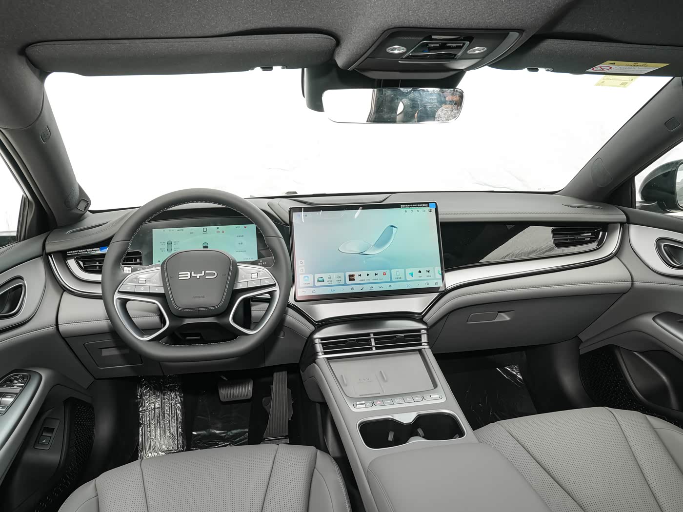 进入车内,内饰延续海洋网的简约科技风格,中控台采用非对称设计,向驾驶员一侧微微倾斜,操作更便捷。全系标配 10.25 英寸全液晶仪表盘与 12.8 英寸悬浮式中控屏,高配车型升级为 15.6 英寸可旋转大屏,搭载 DiLink 4.0 智能网联系统,支持语音交互、CarPlay 无线互联及 OTA 升级。中控下方采用悬浮式鞍座设计,整合电子挡把、驾驶模式切换按键与无线充电板(尊贵型及以上),下方开放式储物空间可放置手机、钥匙等小物件,空间利用率拉满。