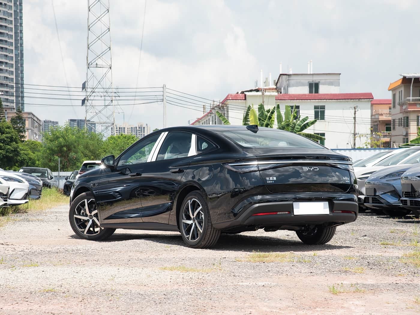 再来看车尾部分,车尾设计层次分明,贯穿式 LED 尾灯与头灯形成呼应,灯组内部采用点阵式光源,刹车时呈现流水动态效果,夜间点亮极具辨识度。后备厢上沿的鸭尾式扰流板与下方扩散器造型,既优化空气动力学表现,又增强运动气息。车尾标识清晰标注 “DM-i” 混动身份,排气采用隐藏式设计,配合圆润的尾部轮廓,将运动感与家用轿车的沉稳气质巧妙融合。紧凑的尾部造型并未牺牲实用性,后备厢开口宽度达 1100mm,方便大件物品装卸。