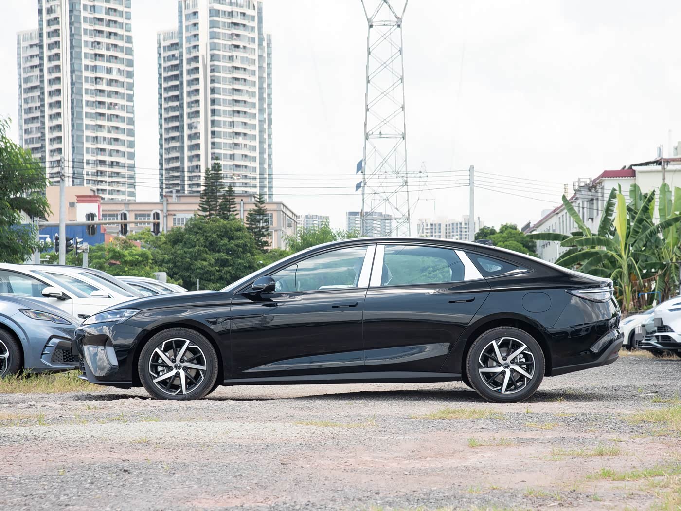 再来看车身侧面部分,车身侧面采用溜背式设计,4830/1875/1490mm 的长宽高与 2820mm 轴距,构成标准中型轿车的修长比例,不仅视觉上更显大气,更为车内空间奠定基础。隐藏式车门把手降低风阻的同时提升科技感,窗台线从 B 柱后缓缓上扬,营造出蓄势待发的运动姿态。121KM 及以上版本搭载 18 英寸双色旋风轮毂,搭配黑色轮眉,强化跨界运动氛围;入门版则配备 17 英寸多辐轮毂,兼顾经济性与实用性。整车风阻系数降低,为低油耗提供助力。