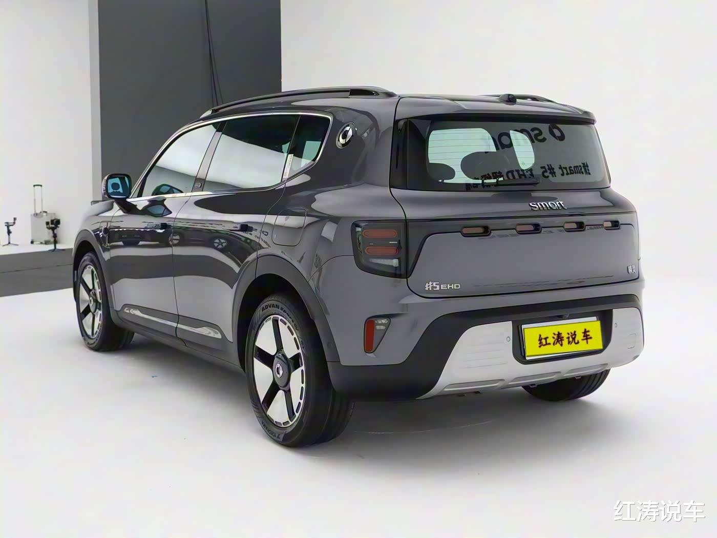 Smart精灵#5 EHD超级电混共推出4款车型,指导价格区间为18.99万元-23.99万元,限时到手价16.99万-21.99万元,外观采用“时空胶囊”的设计语言,前包围应用“哑光拉丝”工艺制成的车身饰板,车尾还应用胶囊样式的尾灯组,配有无框车门、隐藏式门把手、19英寸轮辋、车顶行李架等,整车长宽高分别为4705/1920/1710毫米,轴距为2900毫米,定位于中型SUV。