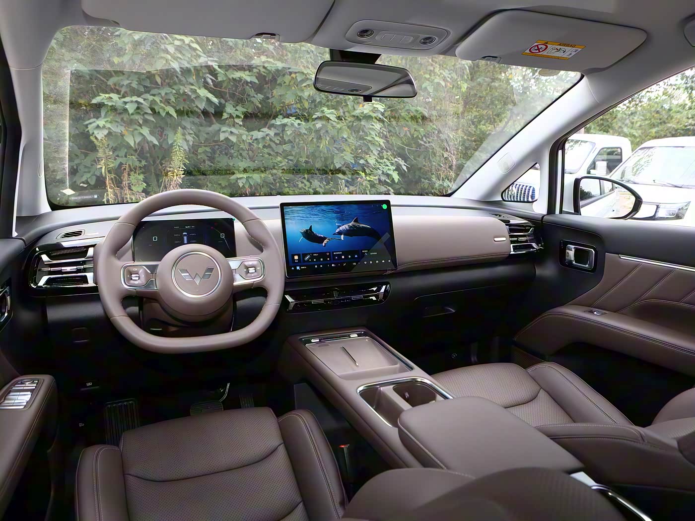 进入车内,内饰采用胡桃棕与暖沙棕双色搭配,营造出温馨的家庭氛围,中控台大面积软性材质包裹,触感细腻且耐脏易打理。12.8 英寸悬浮式中控屏响应迅速,支持语音控制与手机互联,还能切换小憩、露营等场景模式 —— 露营时可开启对外放电,秒变移动电源。2910mm 轴距带来的 “2+2+3” 真七座布局,将空间利用率做到了 88%。中排独立座椅支持前后滑动与靠背调节,230mm 的过道宽度让第三排乘客进出无需侧身,彻底解决了传统 MPV “第三排进出难” 的痛点。身高 175cm 的乘客落座第三排时,腿部仍能保留两拳余量,头部空间也不会有压抑感。