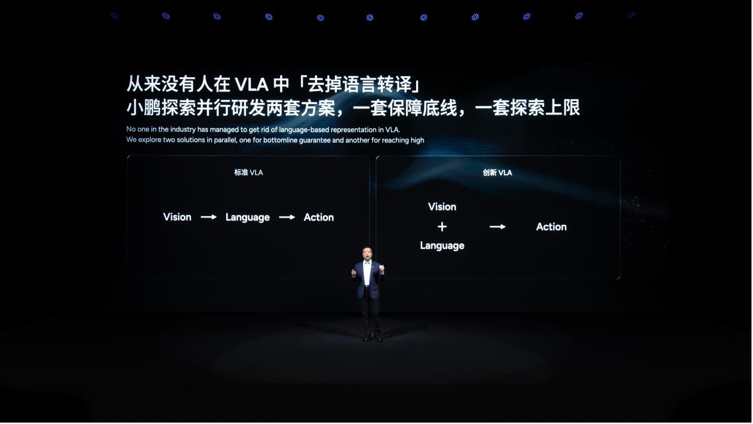 这次最核心的技术突破,当属第二代 VLA 大模型。咱们不用纠结 “VLA” 这三个字母啥意思,只需要知道它是物理 AI 的 “大脑”—— 过去行业里的类似模型,得先把视觉信号(比如摄像头看到的路况)转成文字描述,再根据文字生成动作指令,就像人先 “看懂” 再 “思考” 最后 “动手”,中间绕了个弯。而小鹏的第二代 VLA 直接跳过了 “语言转译” 这一步,视觉信号进来,直接输出动作指令,反应速度快了不少,还成了行业里首个能量产的物理世界大模型。