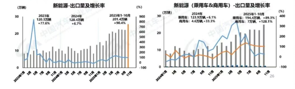相比内销,新能源汽车出口的表现也颇为不错,首次超过200万辆。1-10月,新能源汽车出口201.4万辆,同比增长90.4%。其中,新能源乘用车出口194.4万辆,同比增长89.3%;新能源商用车出口7万辆,同比增长1.3倍。