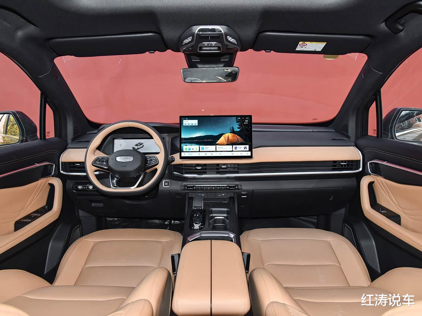 新款豪越L的内饰同样延续2024款车型的设计,车内为双拼配色,经常碰触的地方都是软性材质覆盖和皮质包裹,中间有贯穿样式的空调出风口,配备皮质多功能方向盘、10.2英寸液晶仪表和14.6英寸悬浮式中控大屏,在售车型搭载的是吉利银河OS 2.0系统,而新款豪越L搭载的是Flyme Auto智能座舱系统,支持车联网、OTA升级、手机APP远程控制、语音识别控制、多指飞屏、应用商店等。