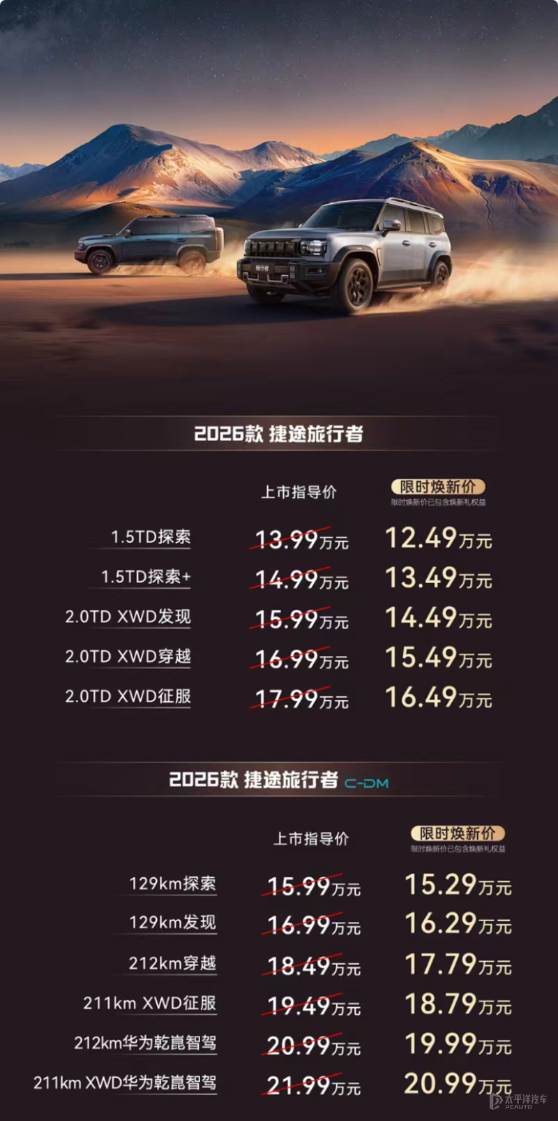 11月17日,在捷途汽车的旅行者之夜暨第四届旅行+大会上,2026款捷途旅行者(查成交价|车型详解)/旅行者C-DM正式上市,新车共推出了11款车型(旅行者5款,旅行者C-DM6款)。2026款旅行者官方指导价格为13.99-17.99万元,2026款旅行者C-DM官方指导价15.99-21.99万元,同时在享受置换补贴的情况下享有限时焕新价。此次捷途山海T2正式更名为旅行者C-DM,也是回应了众多用户的建议将山海T2归入旅行者系列的声音,这对于打造捷途旅行者的综合影响力也有很大的帮助。