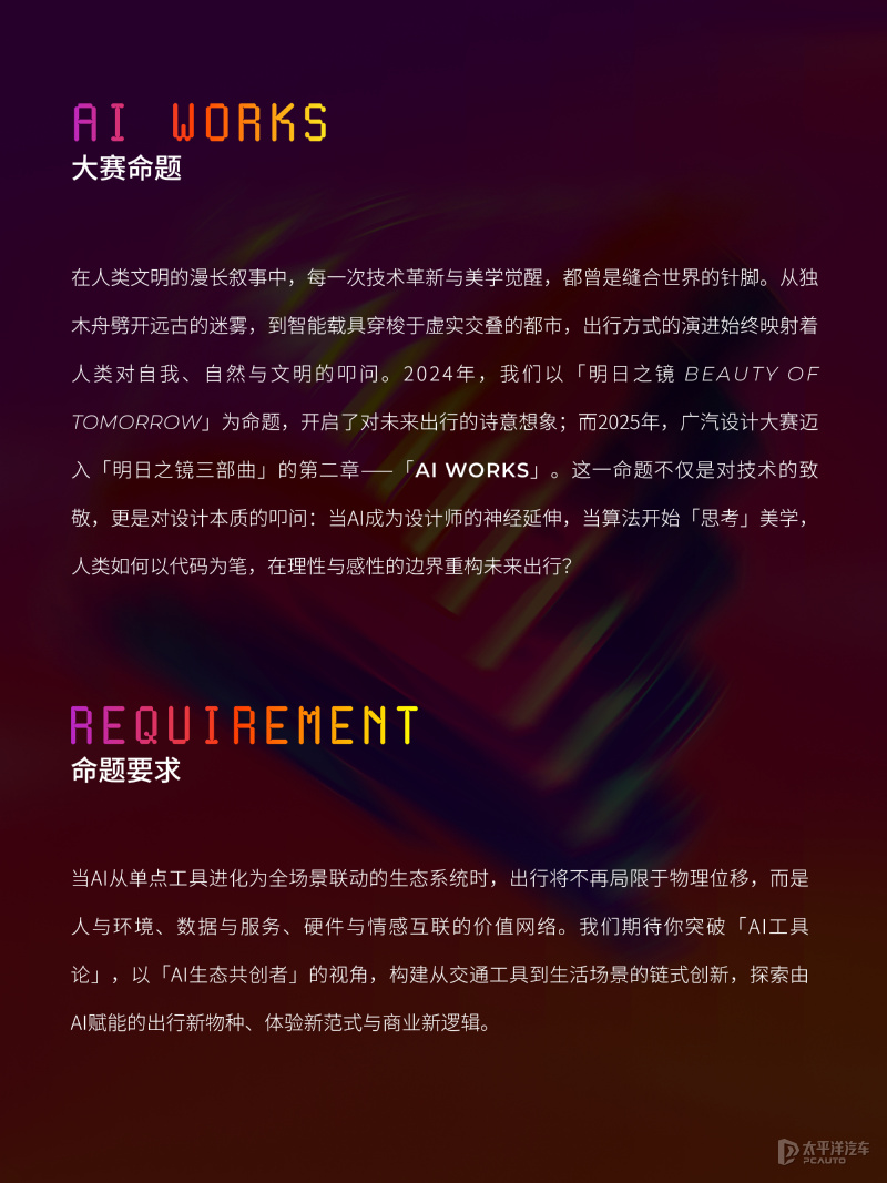 大赛通常设置前瞻性的主题(如2025年的“明日之镜:AIWORKS”),邀请学生探索未来出行解决方案,并提供全流程的专业培训和国际化的交流平台。优胜者有机会获得广汽研究院的实习或优先聘用机会,为中国汽车设计行业输送新生力量。