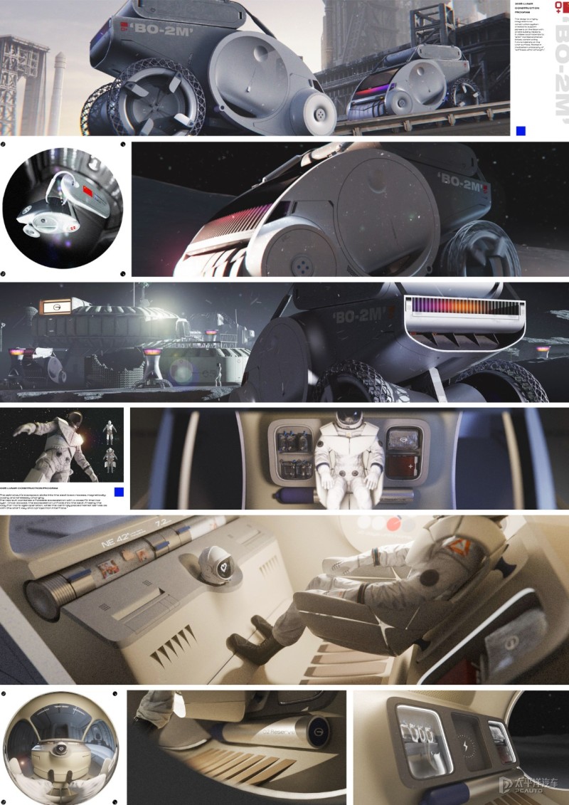 作品《B2M月匠》跳出地球视野,聚焦宏大的“深空资源战略”。作品将东方哲思中的“刚骨柔意”与硬核科技结合,构想了一套利用AI规划、能将月壤就地“打印”为榫卯砖块的月面建造系统,为人类在荒芜月面筑起温情的“第二家园”。