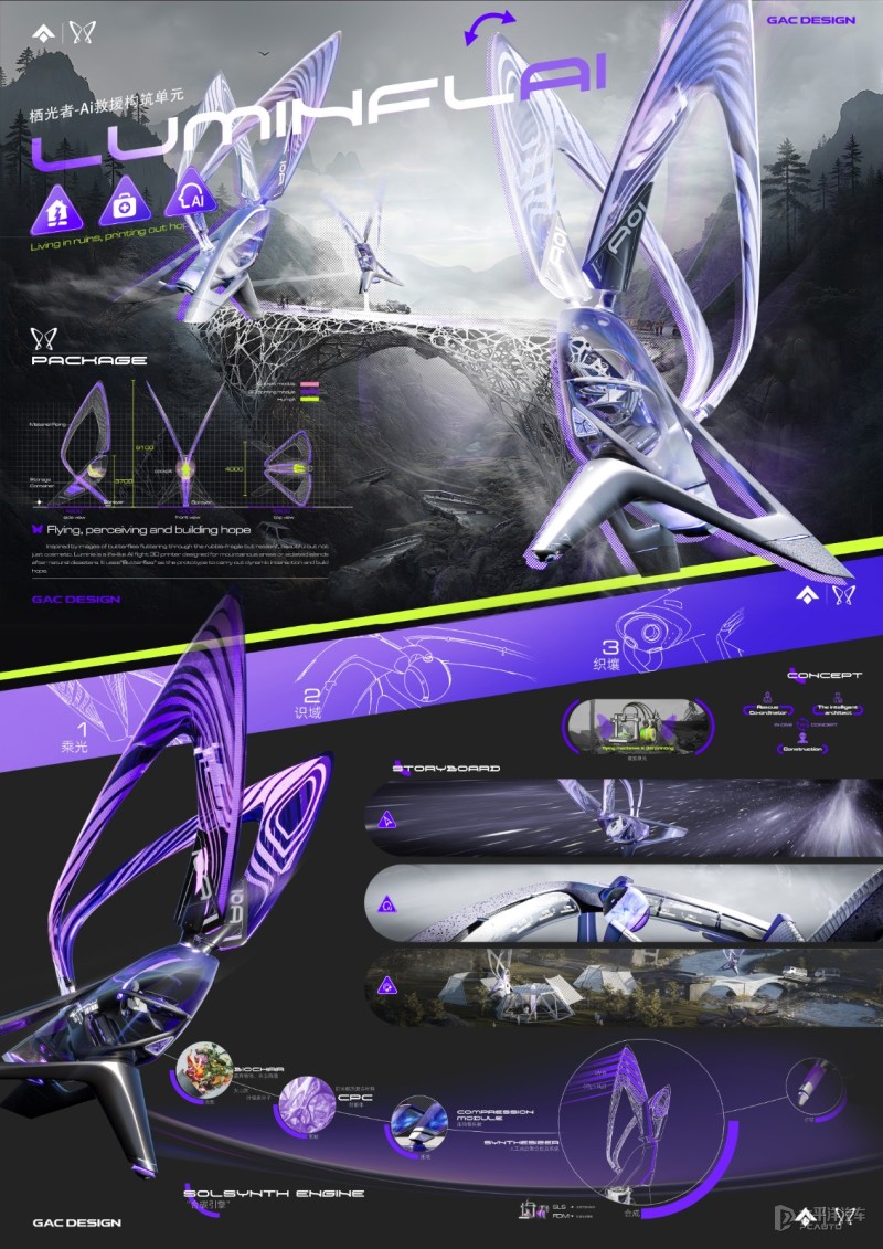 作品《LUMINFLAI栖光者》体现了设计对生命的极致关怀。受“蝴蝶飞越废墟”的生命隐喻启发,该设计构建了一个AI驱动的灾害管理体系:利用仿生扑翼载具穿梭复杂地形,高效识别生命信号并即时打印庇护所,为灾后“黄金72小时”救援提供了全新解决方案。