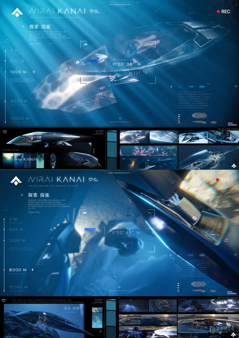 作品《遥望之岸-NiraiKanai双生》将视角投向深海,设计了一款旨在抢救海洋“记忆碎片”的仿生潜航器。该作品描绘了通过采集基因、恢复生态,实现陆地与海洋“和谐双生”的未来愿景。