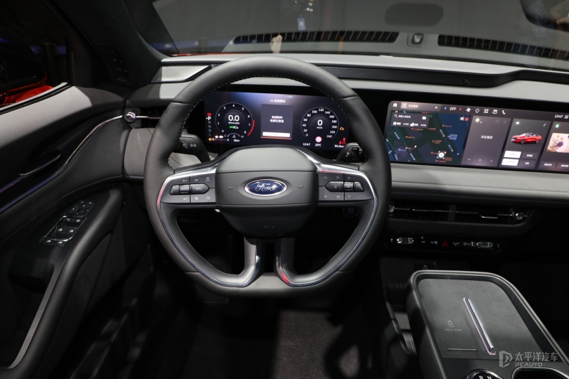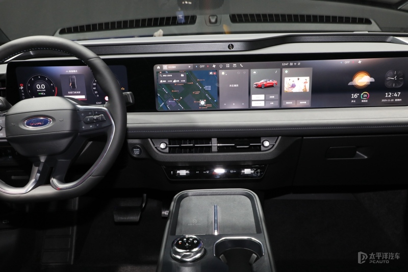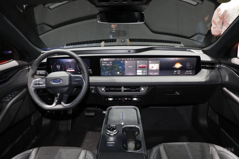新蒙迪欧的座舱布局强调科技感,最引人注目的是由12.3英寸全液晶仪表+27英寸中控屏组成的超广域高清巨幅屏。这一屏幕系统整合了驾驶信息与娱乐控制,几乎覆盖了整个中控台区域,营造出强烈的科技氛围。