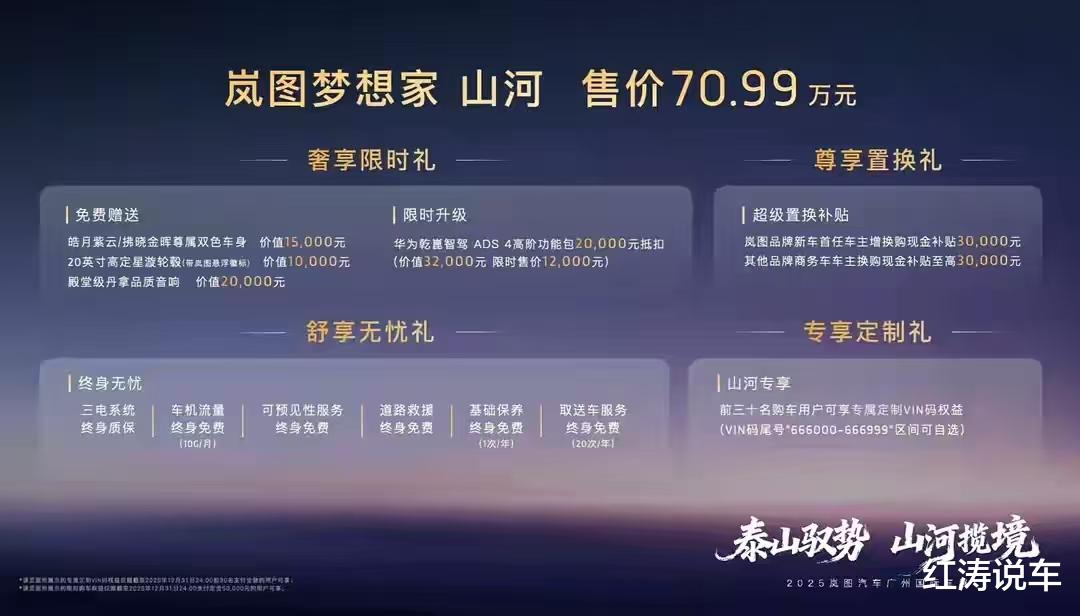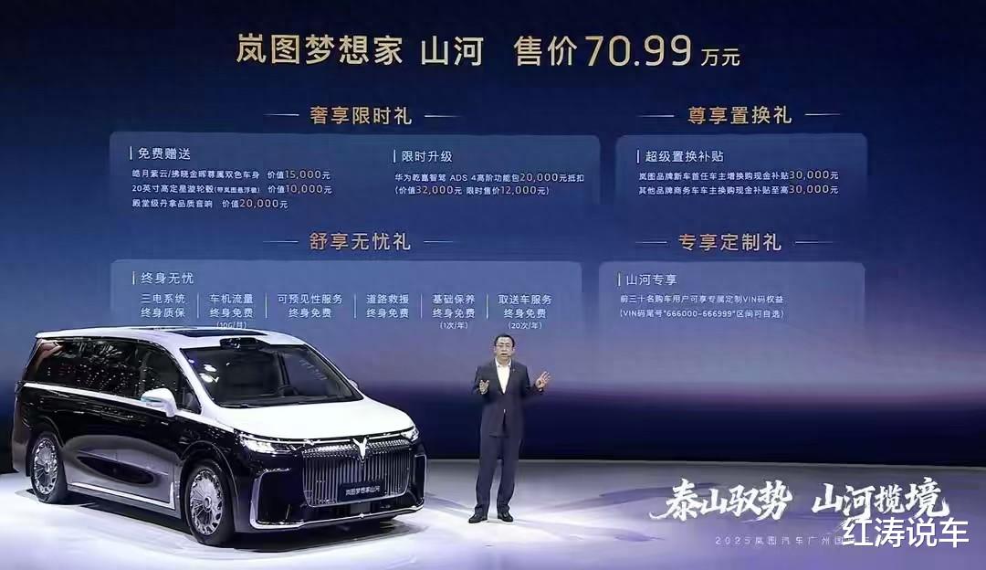 国产新能源品牌不断冲击高端市场,其中有些选手获得了成功,比如岚图梦想家,就取得了不错的销量成绩。就在11月21日,2025广州车展正式开幕。岚图汽车宣布,梦想家山河正式上市,官方指导价为70.99万元,该车采用全新四座布局,搭载华为乾崑ADS 4辅助驾驶系统和鸿蒙座舱5车机系统,成为了梦想家系列的旗舰车型,那么它是不是你想要的座驾呢?