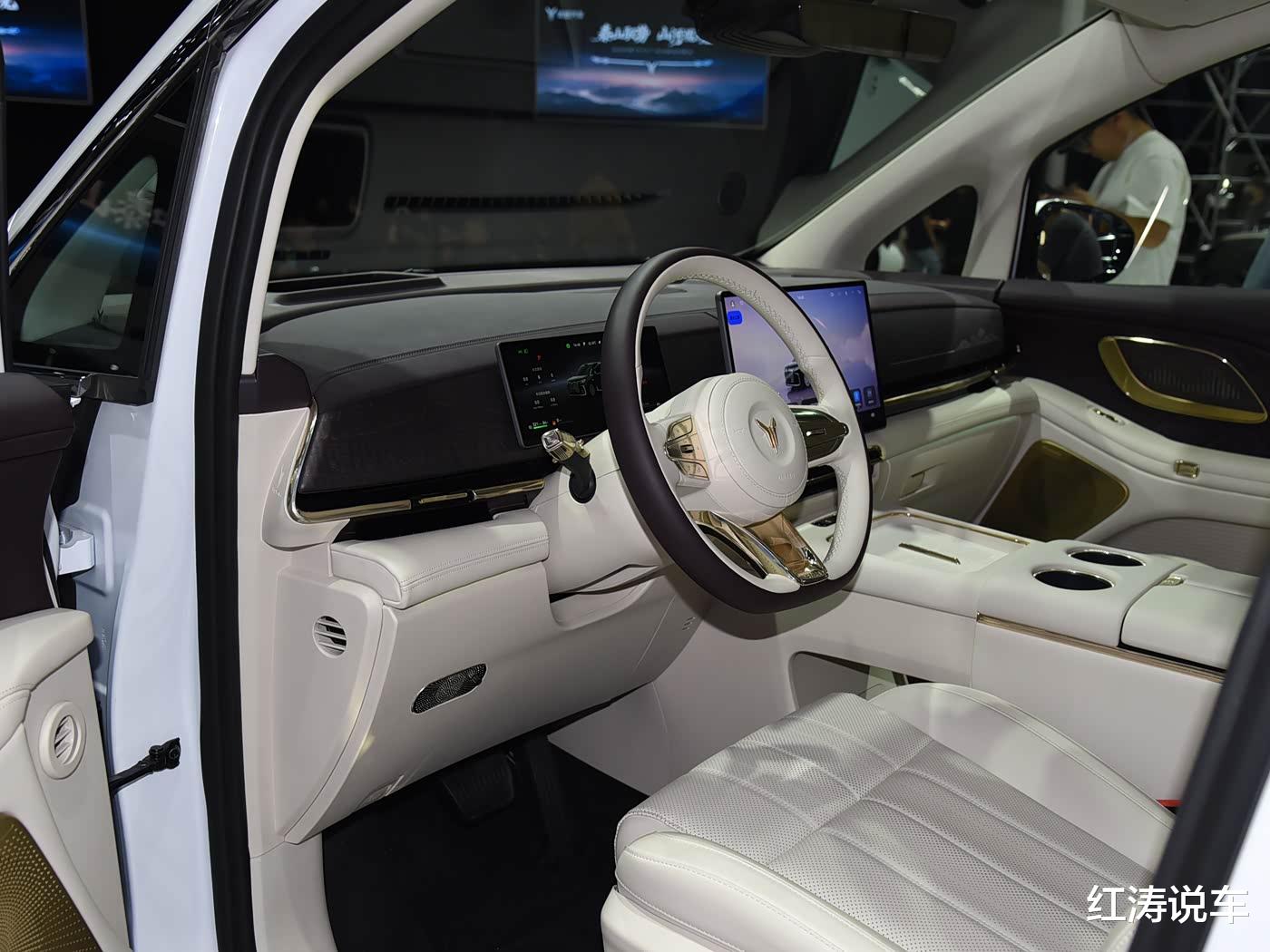岚图梦想家山河的长宽高分别达到了5315*1998*1800毫米,轴距为3200毫米,这么一个大块头放在展台,总会让人忍不住想多看它几眼,配备双侧电动侧滑门,并且前排是电动吸合车门,全车均是多层隔音玻璃,后排还有隐私玻璃和电动遮阳帘,配备20英寸大饼样式的电镀轮毂,轮毂中心车标为悬浮式设计。