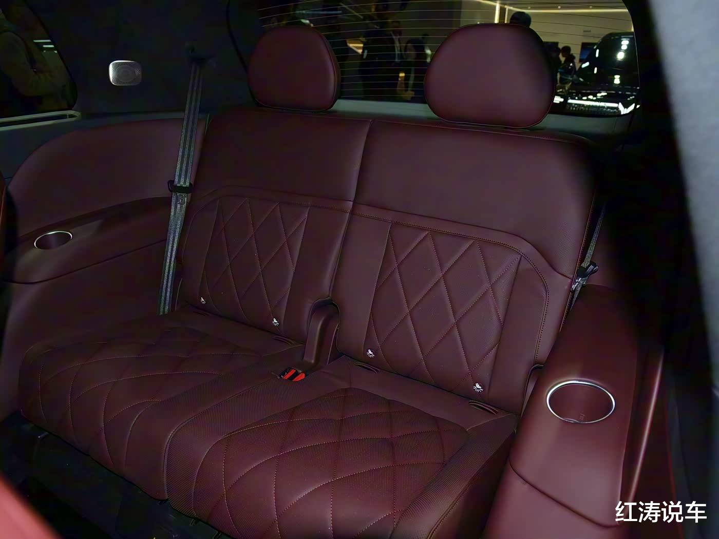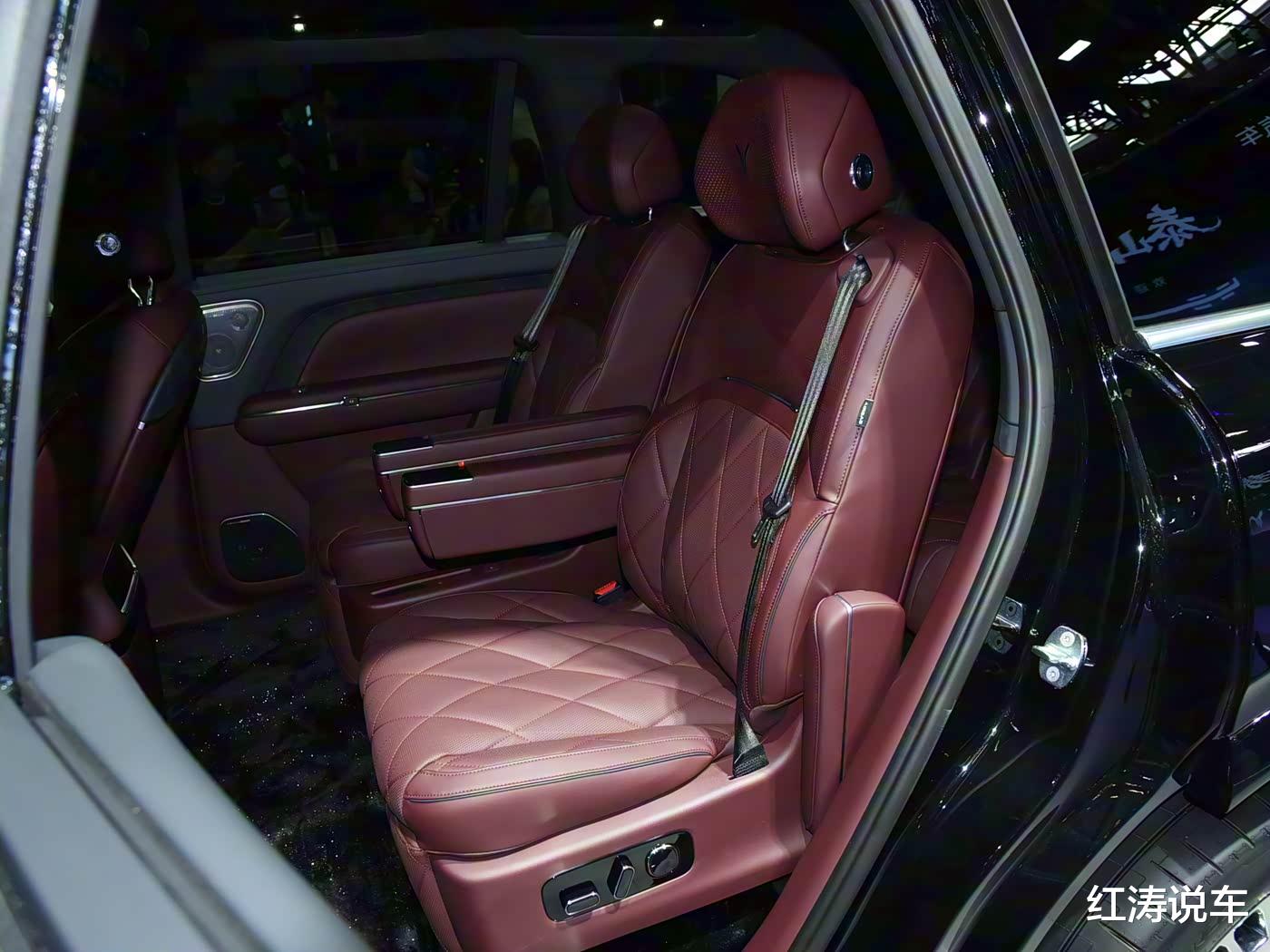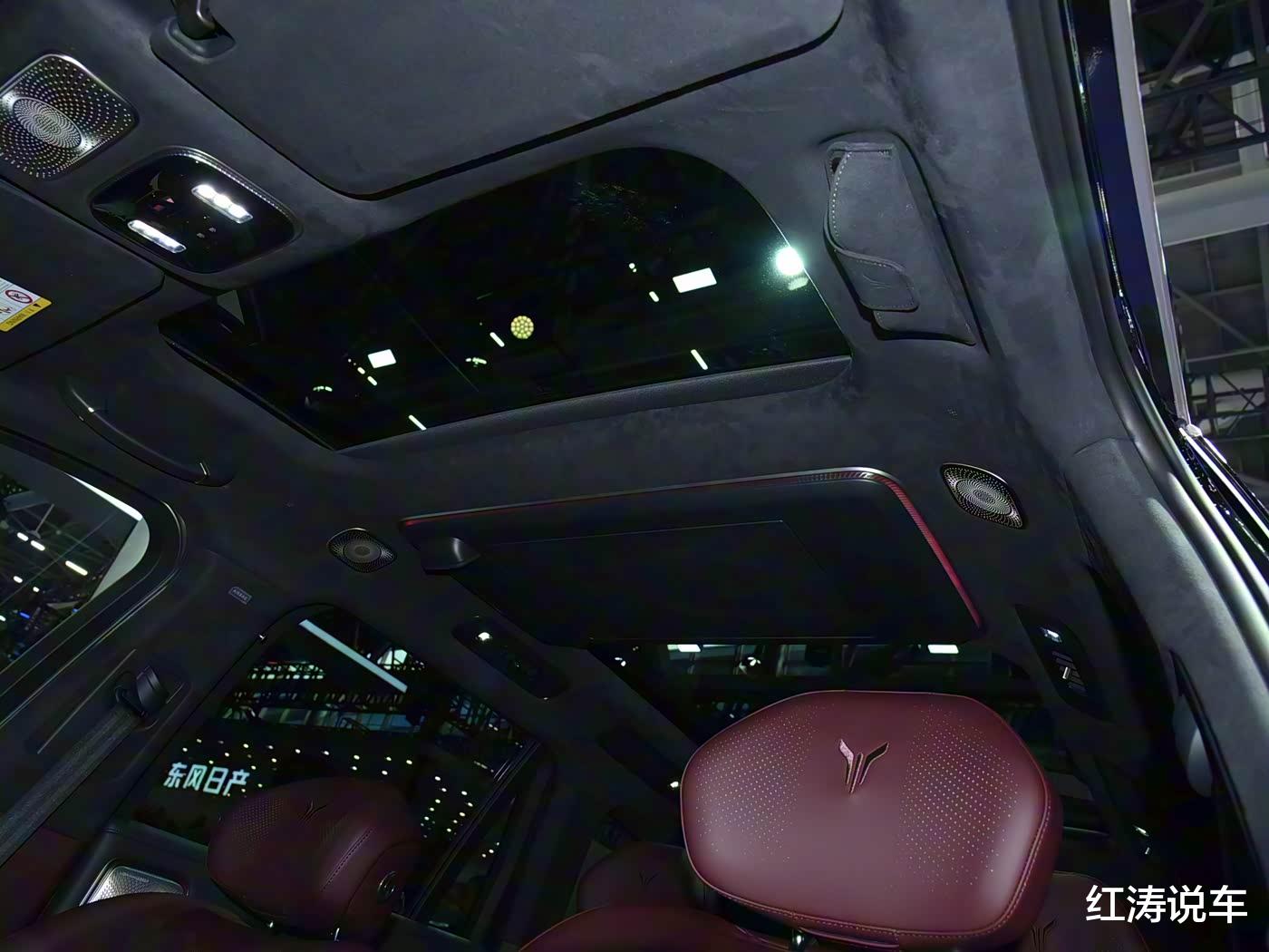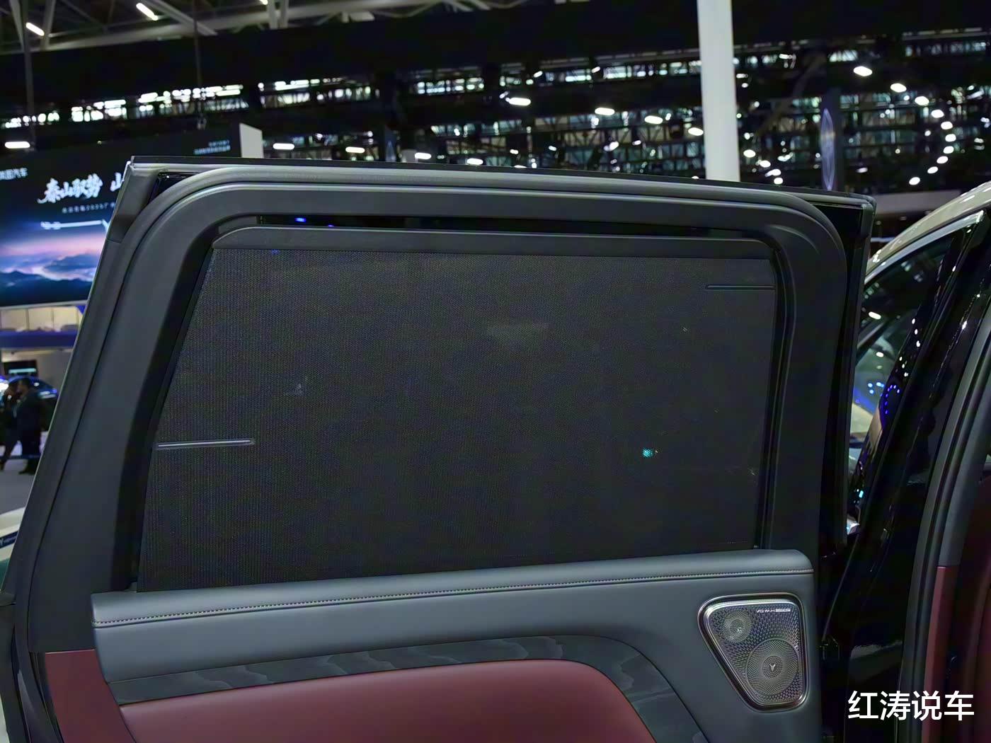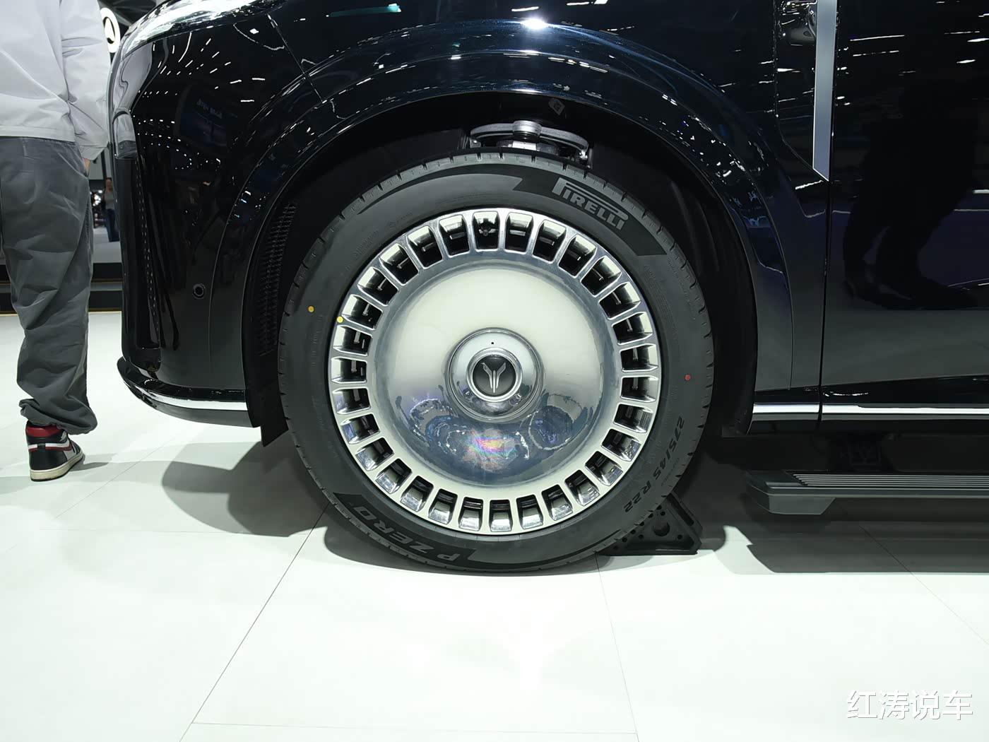 岚图泰山长宽高分别为5230/2025/1817毫米,轴距3120毫米,这个大块头放在展台,总会让人忍不住想多看它几眼,配备22英寸大饼状电镀轮毂,半隐藏式门把手内部可映射出点阵式星光效果,提供有电动侧踏以及迎宾光毯,每侧车门下方还配备有4颗超声波雷达,提供智能感应电动门功能,全车为多层隔音玻璃,后排是隐私玻璃,可价2万元选装全车电动吸合车门。