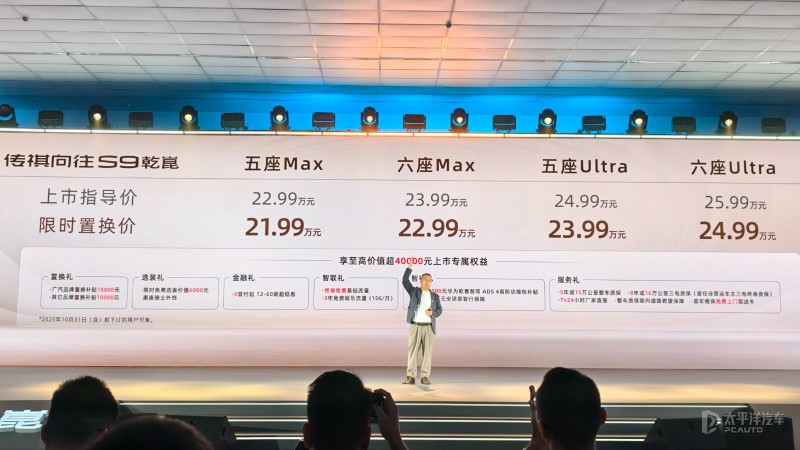 9月19日,传祺向往S9正式上市,新车共推出4款车型,售价区间为22.99万元-25.99万元。新车定位中大型SUV,提供5座/6座可选,搭载1.5T双电机插混系统,百公里加速6.6秒,CLTC纯电续航252km,综合续航超1200km。此外,新车全系搭载华为乾崑ADS4和鸿蒙座舱5。