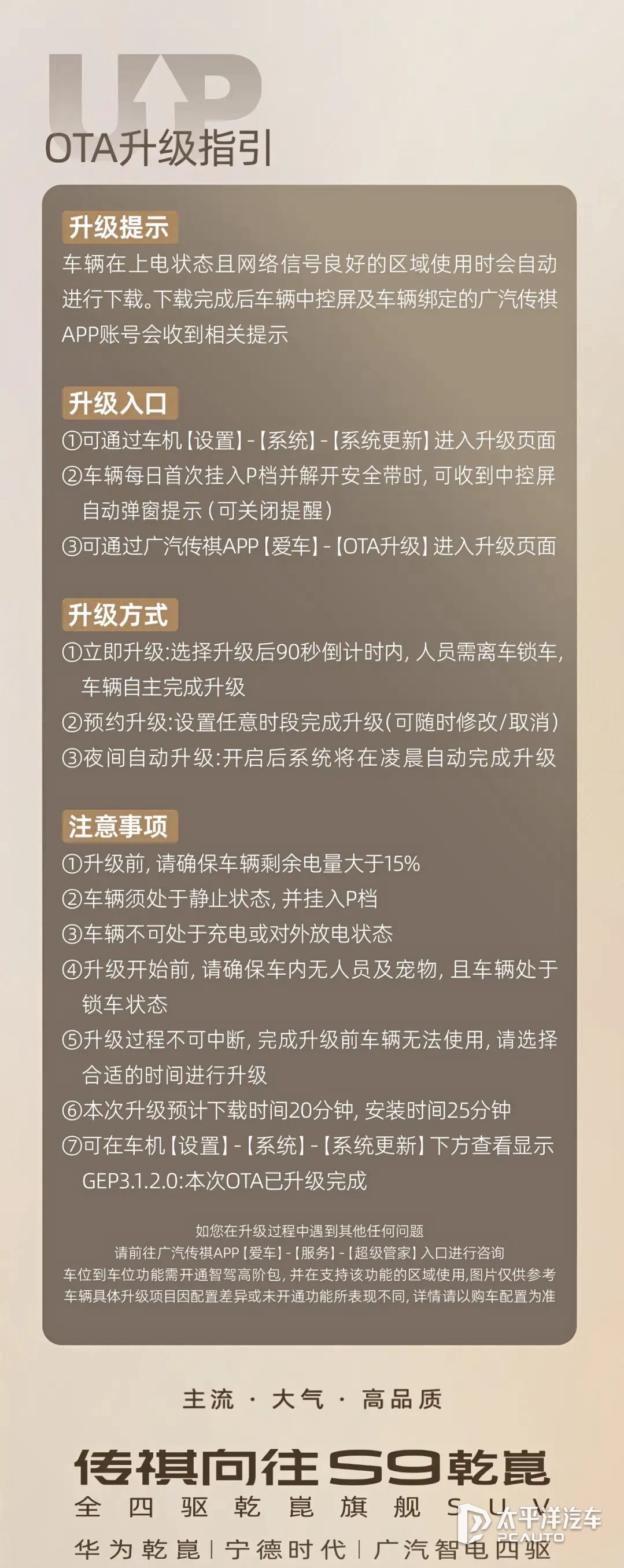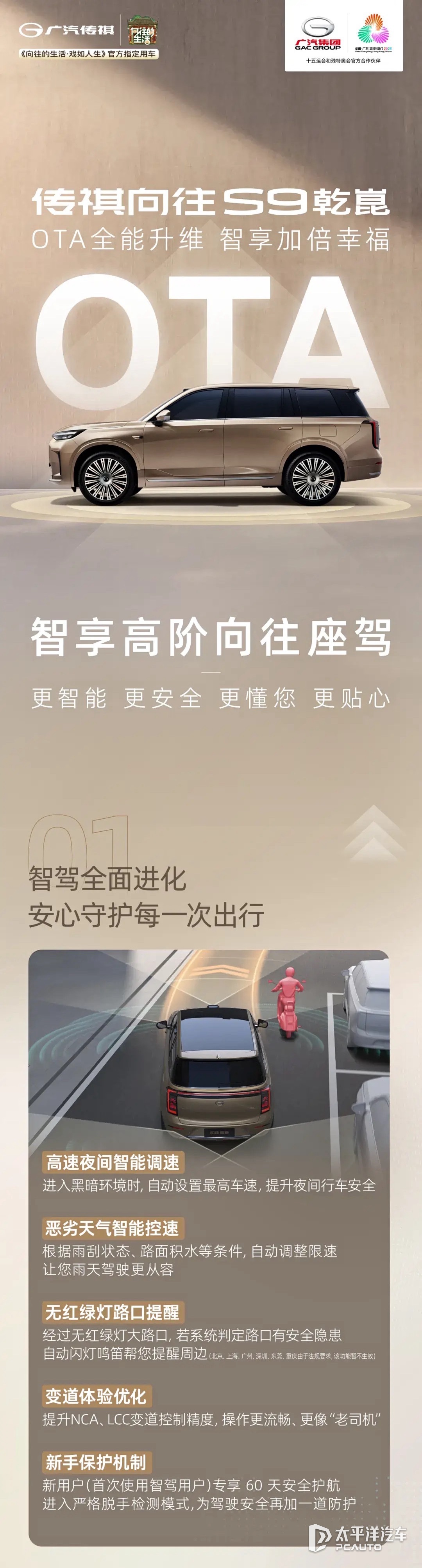 11月28日,传祺向往S9乾崑推出GEP3.1.2.0版本更新,此次升级主要针对驾驶辅助功能,在行车安全、智能泊车、行车指示、人车交互等方面有所升级。