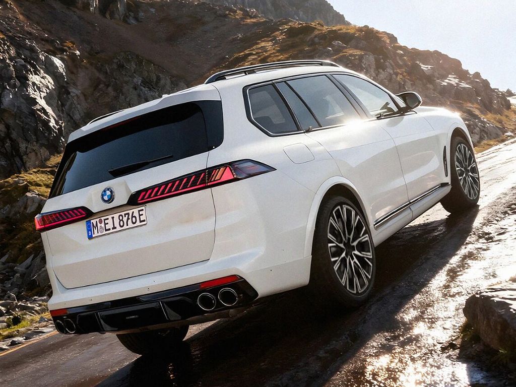 侧面相较现款宝马X7主要的不同点在于采用了电子式门把手,并且设计师还将它给布置于水切位置,也算是有点新意。讲真,如果全新一代宝马X7的实车真长渲染图里这样,我倒觉得还蛮帅的,至少辨识度是强的,你们觉得呢?心里有没有想买的冲动?