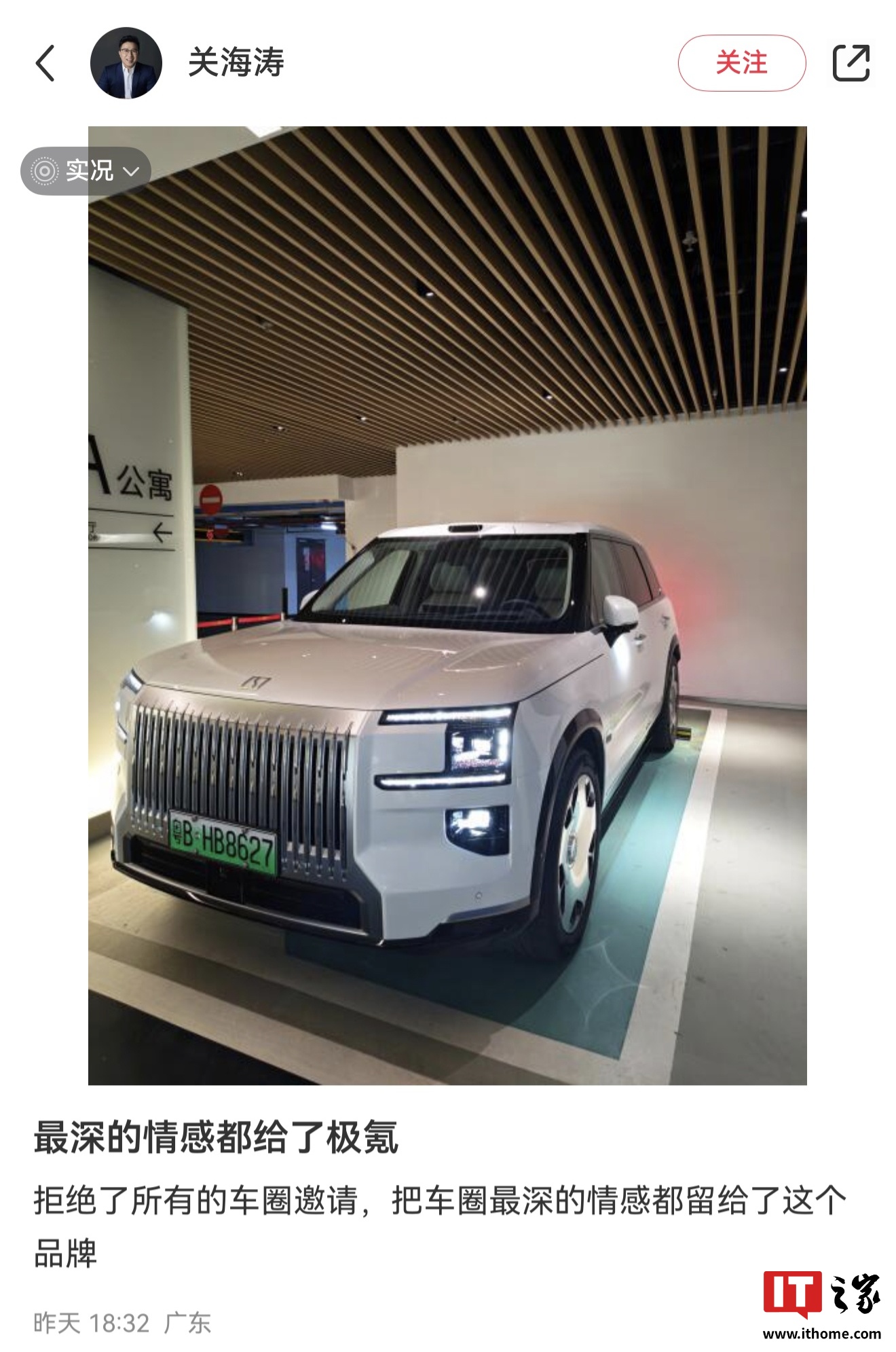 IT之家11月30日消息,前极氪智能科技CBOCMO关海涛昨日发布动态,称拒绝了所有的车圈邀请,把车圈最深的情感都留给了极氪品牌。